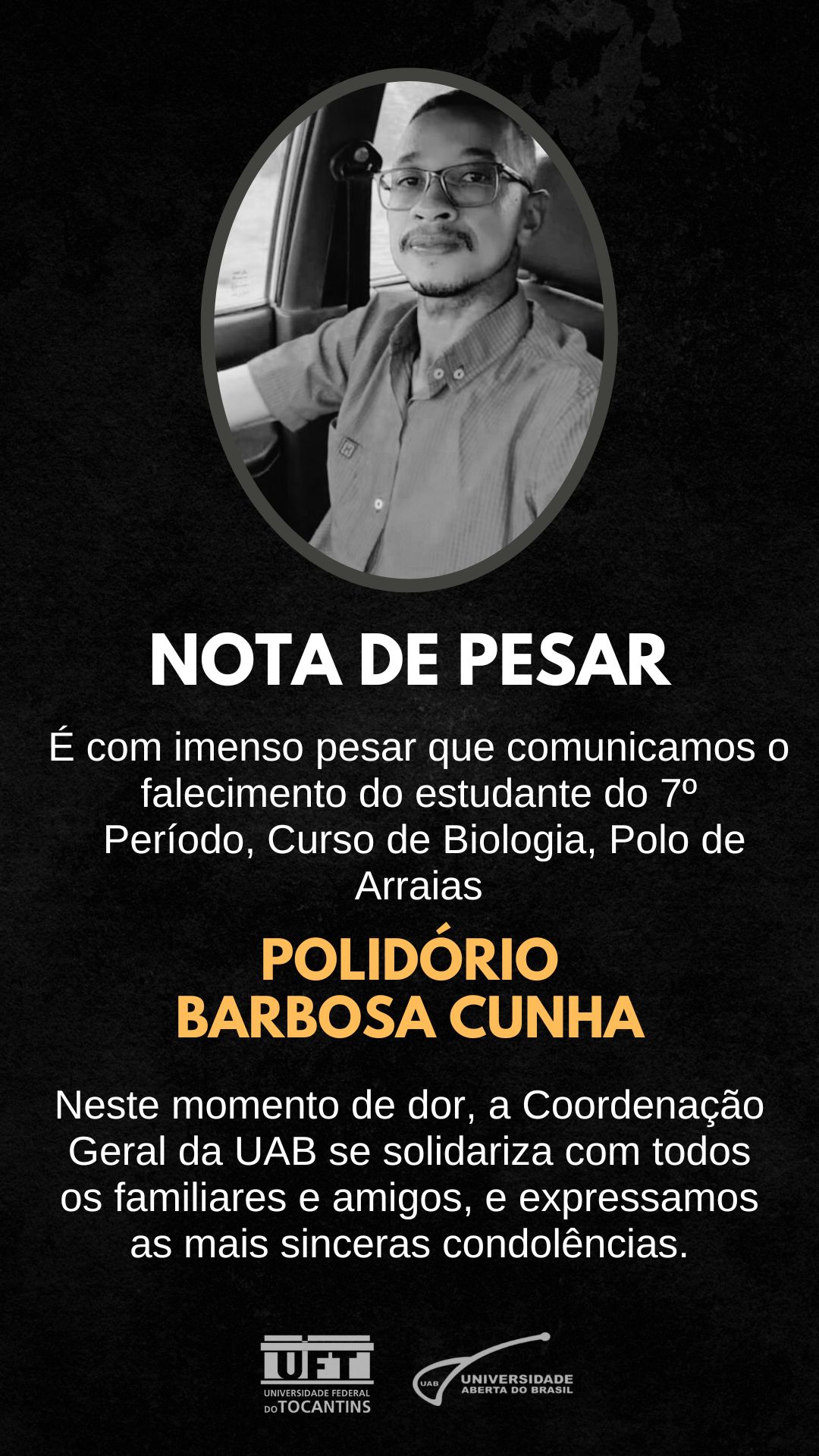 Neste momento de dor, a Coordenação Geral da UAB/UFT solidariza-se com todos os familiares e amigos e expressa as mais sinceras condolências.