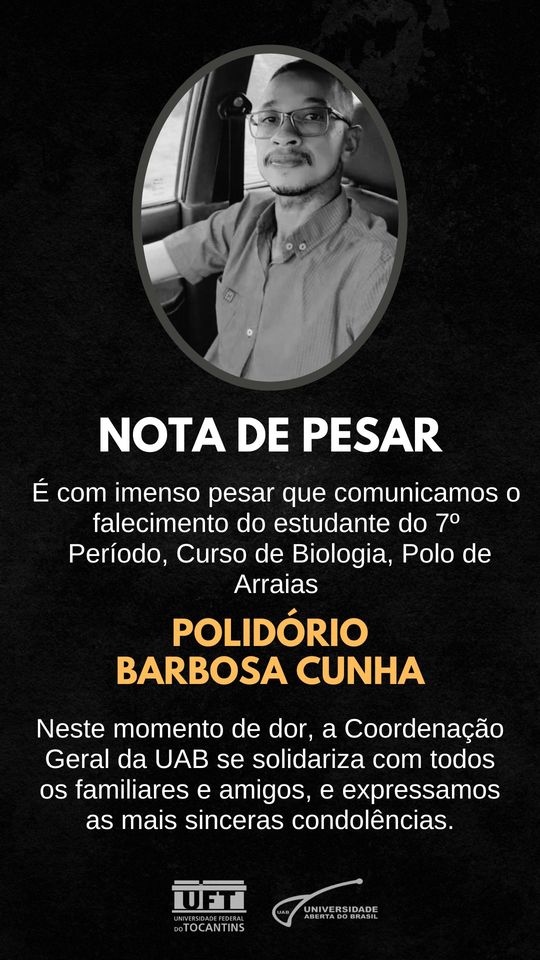 É com imenso pesar que comunicamos o falecimento do estudante POLIDORIO BARBOSA CUNHA, do 7º período do Curso de Biologia, Polo de Arraias.