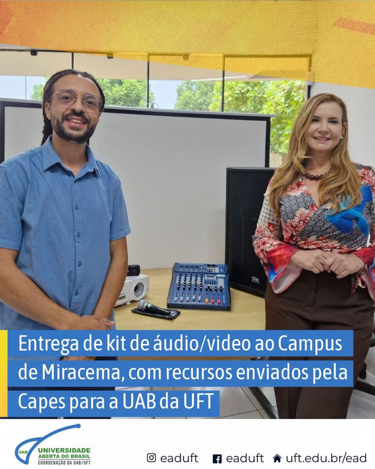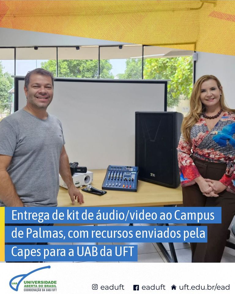 A Coordenação da Universidade Aberta do Brasil (UAB) na Universidade Federal do Tocantins (UFT) realizou, na última terça-feira (21/10), a entrega dos primeiros kits de áudio e vídeo para os câmpus de Palmas e Miracema. A aquisição foi viabilizada por meio de recursos destinados pela Coordenação de Aperfeiçoamento de Pessoal de Nível Superior (CAPES), reforçando o compromisso com a infraestrutura da educação a distância (EaD) na instituição.
