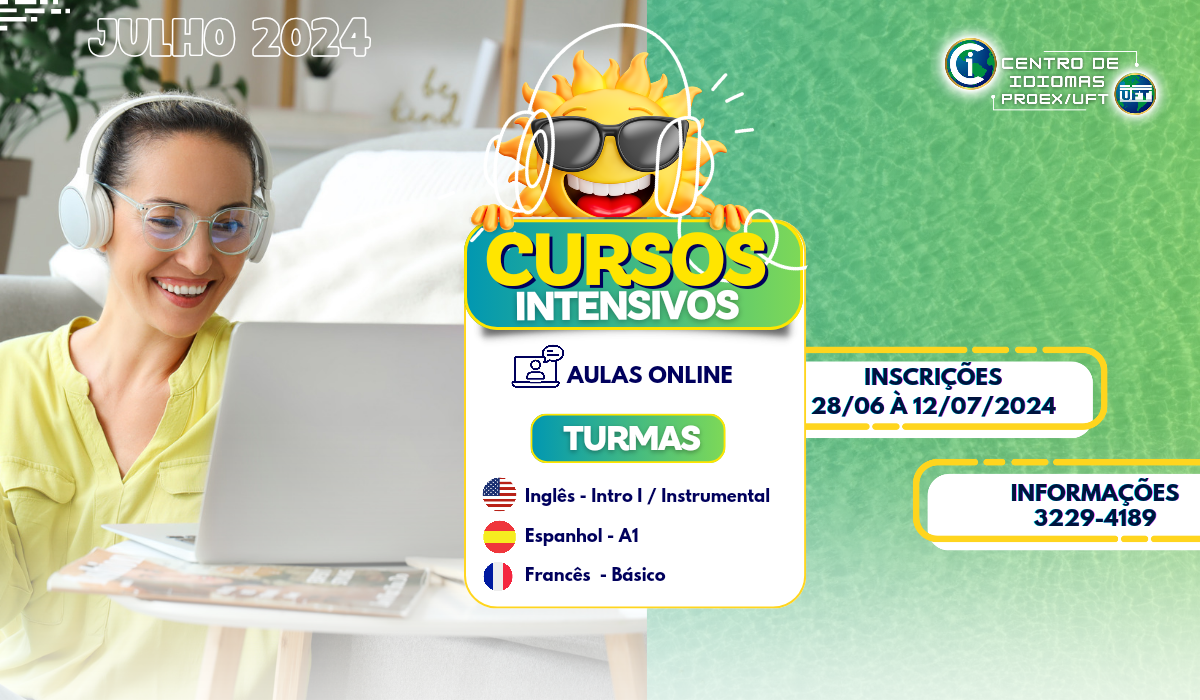 O Centro de Idiomas Digital da UFT está com inscrições abertas para os Cursos Intensivos Online Julho/2024. Os cursos oferecidos são Inglês, Espanhol e Francês. As inscrições podem ser realizadas até 12 de julho, no Sistema de Cursos e Eventos da Fundação de Apoio Científico e Tecnológico do Tocantins (Fapto).
