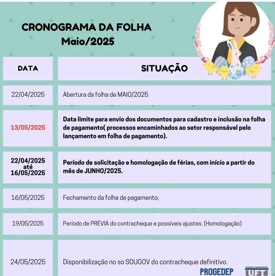13/05/2025 | Data limite para envio dos documentos para cadastro e inclusão na folha de pagamento (processos encaminhados ao setor responsável pelo lançamento em folha de pagamento). |