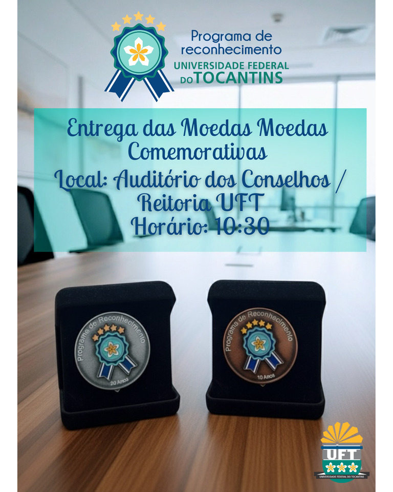 A Universidade Federal do Tocantins realizará, no dia 12 de novembro, a Cerimônia de Entrega da Moeda Comemorativa, homenagem destinada aos servidores de Palmas e da reitoria que completaram 10 ou 20 anos de serviços prestados à Instituição, em conformidade com as diretrizes do Programa de Reconhecimento e Valorização da UFT.