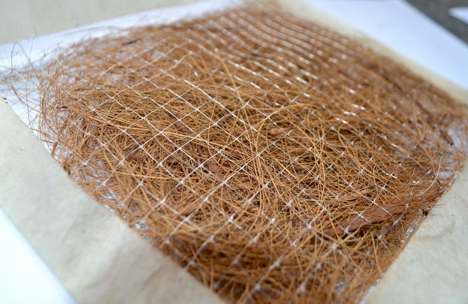 Patente de Modelo de Utilidade para a produção de mantas sintéticas (ou biomantas) destinadas ao controle de processo erosivos superficiais e revegetação, em taludes ou canais, situação bem recorrente em intervenções promovidas pelo setor da construção civil. A proposta traz uma biomanta composta por uma matriz orgânica proveniente das fibras do epicarpo do coco babaçu, as quais são confinadas entre duas redes sintéticas (geralmente polímeros termoplásticos de preferência fotodegradáveis e/ou biodegradáveis) que confinam a matriz e garantem uma maior rigidez e trabalhabilidade durante a aplicação da biomanta. A adoção de fibras do coco babaçu como matriz em mantas sintéticas (ou biomantas) apresenta comportamento semelhante as já existentes no mercado, além de garantir benefícios na redução dos custos de transporte e no incentivo a instalação de novas plantas industriais, em regiões do país onde este vegetal é endêmico.
