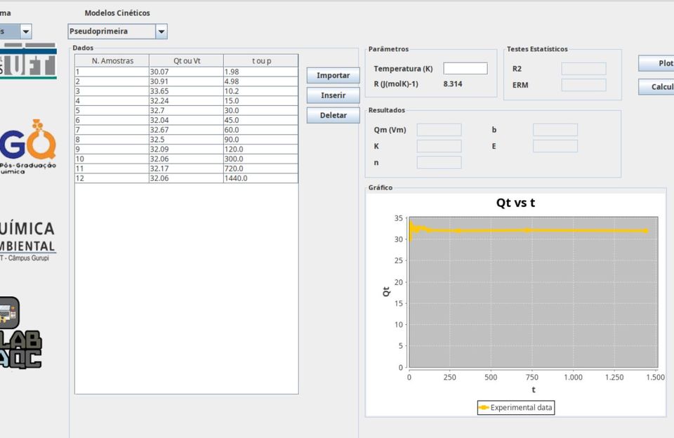 A adsorção é um fenômeno de superfície em que os adsorbatos são adsorvidos na superfície do adsorvente, com o objetivo de retirar estas moléculas líquidas/gasosas da solução em que estão presentes. E devido ao fato de a adsorção ter um baixo custo, fácil operação e alta eficiência, é aplicada em diversas áreas. Para tornar a sua aplicabilidade mais eficiente, é importante realizar o estudo da cinética da adsorção, e consequentemente, a análise de dados e para facilitar as análises, o desenvolvimento de softwares para este fim tornou-se uma possibilidade. Neste contexto, o Adsorption Kinetics Calculations (AKC), é um software de interface intuitiva e de facilitada operação, para o tratamento de dados de análises de cinética de adsorção. O AKC foi desenvolvido em linguagem Java, por meio do Apache Netbeans IDE (Integrated Development Environment - Ambiente de Desenvolvimento Integrado). Ele possui três equações cinéticas implementadas: Pseudoprimeira Ordem não linear, Pseudosegunda Ordem não linear e Difusão Intrapartícula. O software gera os parâmetros cinéticos e estatísticos de cada modelo, as funções de erro implementadas são: coeficiente de determinação (R2) e o ARE (Average Relative Error – Erro Relativo Médio). O software tem capacidade de promover cálculos de testes estatísticos e resultados plotados, o que ajudará pesquisadores a interpretarem qual modelo se ajusta melhor aos dados experimentais.