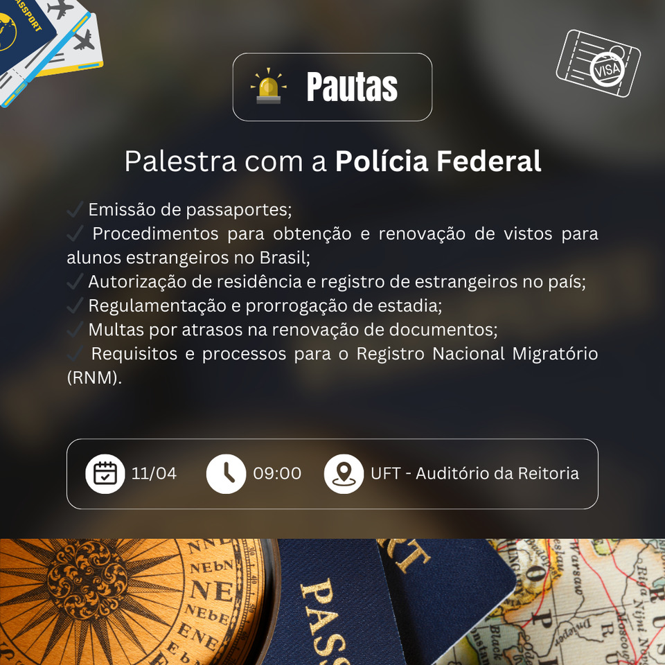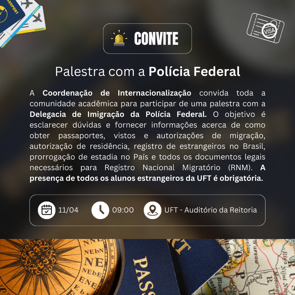 A Coordenação de Internacionalização da Universidade Federal do Tocantins (UFT) tem a satisfação de convidá-los para a Palestra com a Delegacia de Migração, que será ministrada pelo Delegado Artur Vieira De Melo Neto, da Polícia Federal.