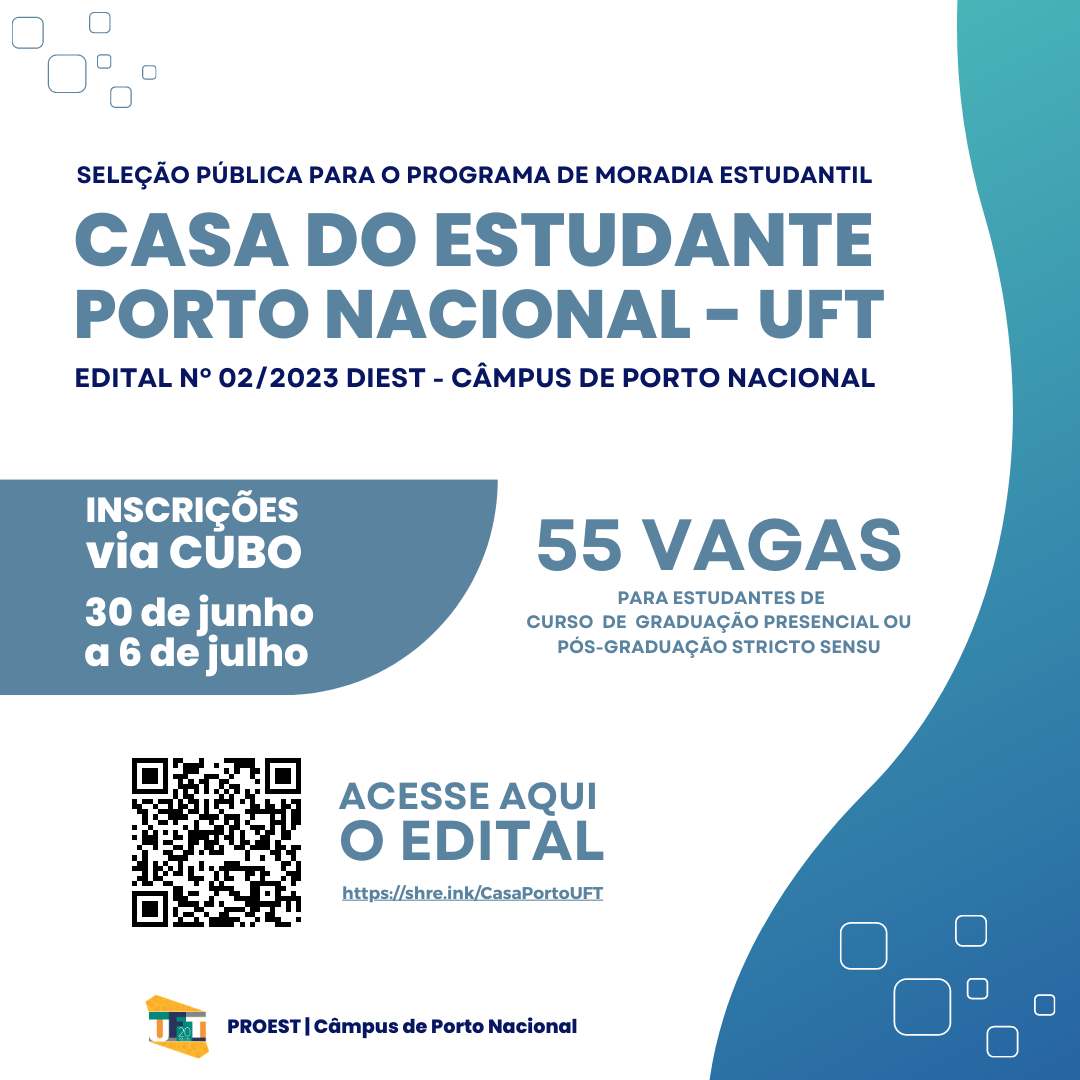 A Pró-Reitoria de Assistência Estudantil (Proest) e a Divisão de Estágio e Assistência Estudantil (Diest) do Câmpus de Porto Nacional publicaram, nesta segunda-feira (26), o edital de seleção de estudantes para o Programa de Moradia Estudantil (PME).