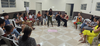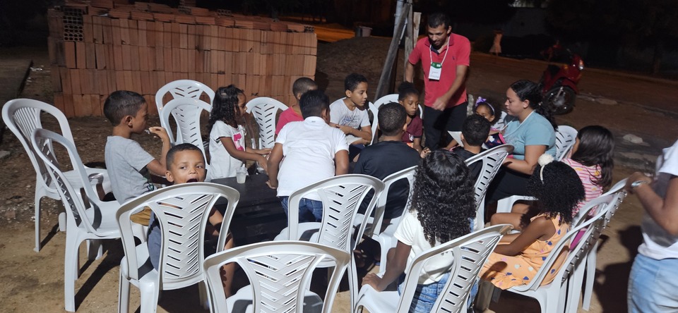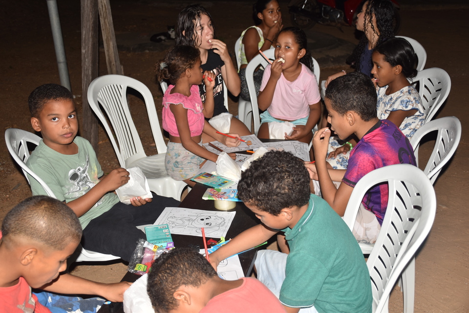 Enquanto as mulheres participavam da roda de conversa, as crianças acompanharam a história “Pipo e Fifi”, sobre a prevenção da violência sexual. O momento foi lúdico, com atividades de desenho e brincadeiras organizadas pelos alunos.