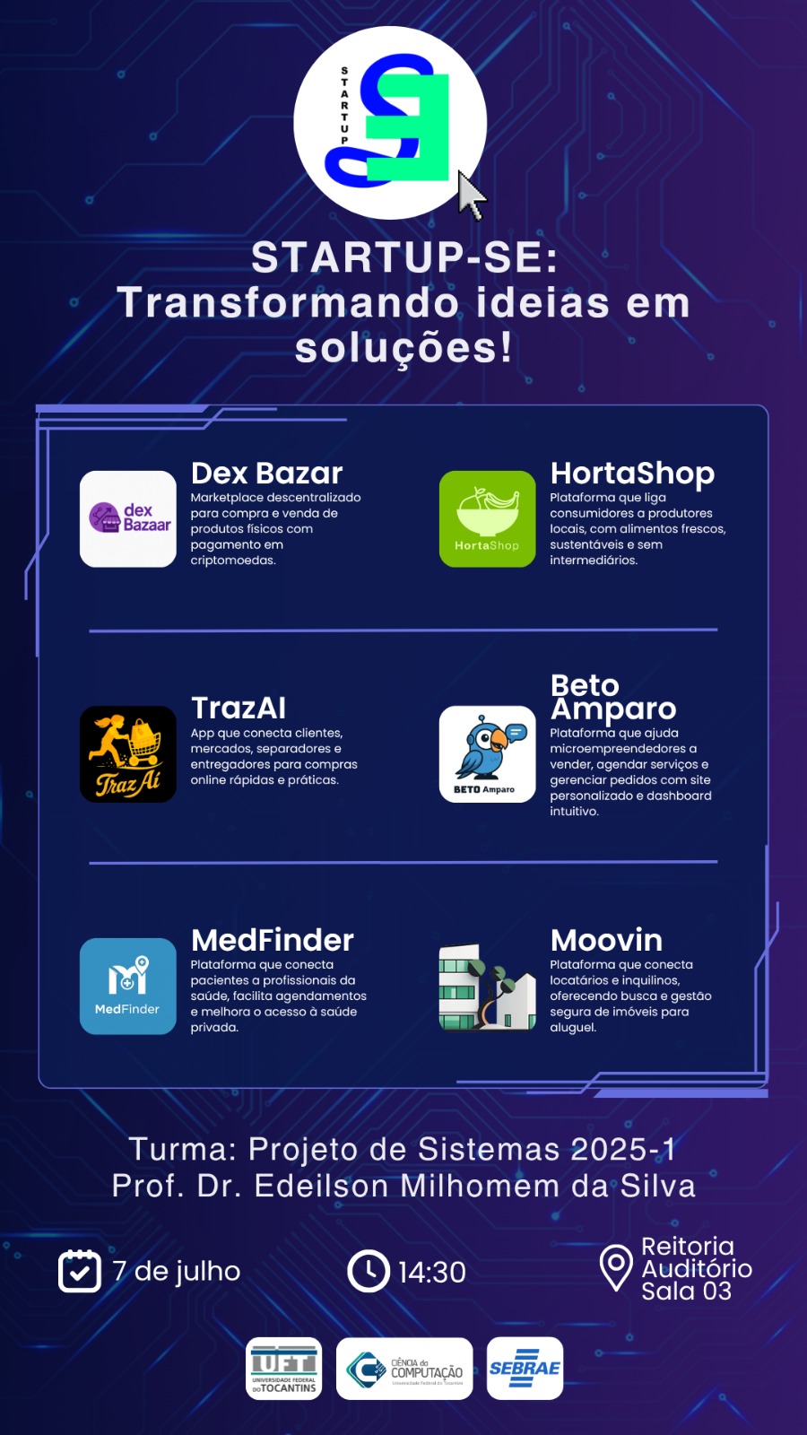 Na próxima segunda-feira, 7 de julho, às 14h30, estudantes da disciplina Projeto de Sistemas, do curso de Ciência da Computação da Universidade Federal do Tocantins (UFT), vão apresentar ao público os projetos desenvolvidos ao longo do semestre. O evento Startup-se será realizado no auditório da Reitoria, no Câmpus de Palmas, e é aberto à comunidade acadêmica e ao público externo.