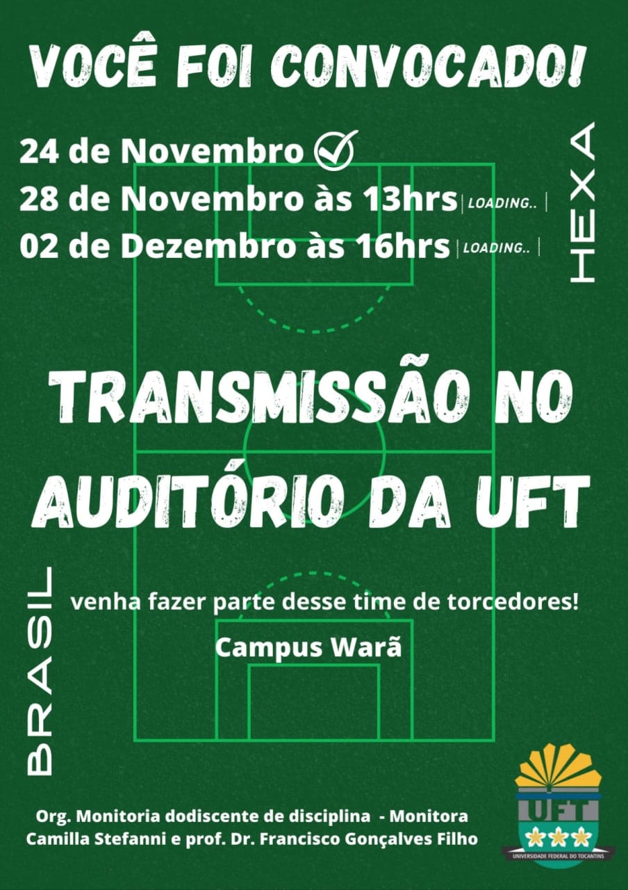 Dando continuidade à experiência positiva da transmissão do primeiro jogo da Seleção Brasileira na Copa do Mundo, do Qatar, o Câmpus da UFT em Miracema transmite a segunda partida do Brasil na competição, nesta segunda-feira ( 28). A transmissão de Brasil x Suíça será realizada no Auditório do Câmpus Warã, a partir das 13h. O Câmpus da UFT em Miracema também transmitirá a partida entre Brasil e Camarões, no próximo dia 02 de dezembro, às 16h.