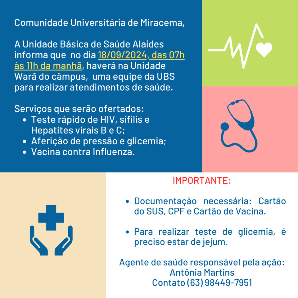 O Câmpus de Miracema da Universidade Federal do Tocantins (UFT) realizará, em parceria com a Unidade Básica de Saúde (UBS) Alaídes Nunes do Amaral, uma ação de saúde no dia 18 de setembro, das 7h às 11h, na unidade Warã. A iniciativa irá oferecer à comunidade acadêmica testes rápidos de HIV, Sífilis e hepatites virais B e C, além de aferição de pressão arterial e glicemia.
