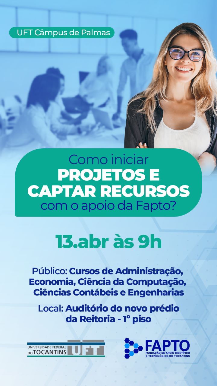 A Direção do Câmpus de Palmas, em parceria com a Pró-Reitoria de Extensão, Cultura e Assuntos Comunitários (Proex), realizará a oficina “Como iniciar projetos e captar recursos com o apoio da Fapto?”, na próxima quinta-feira, 13 de abril. A ação será realizada no auditório do novo prédio da Reitoria, às 9h, e sucederá em etapas, de modo que este primeiro encontro reunirá os técnicos, professores e estudantes dos cursos de Administração, Economia, Ciências Contábeis, Ciência da Computação e Engenharias.