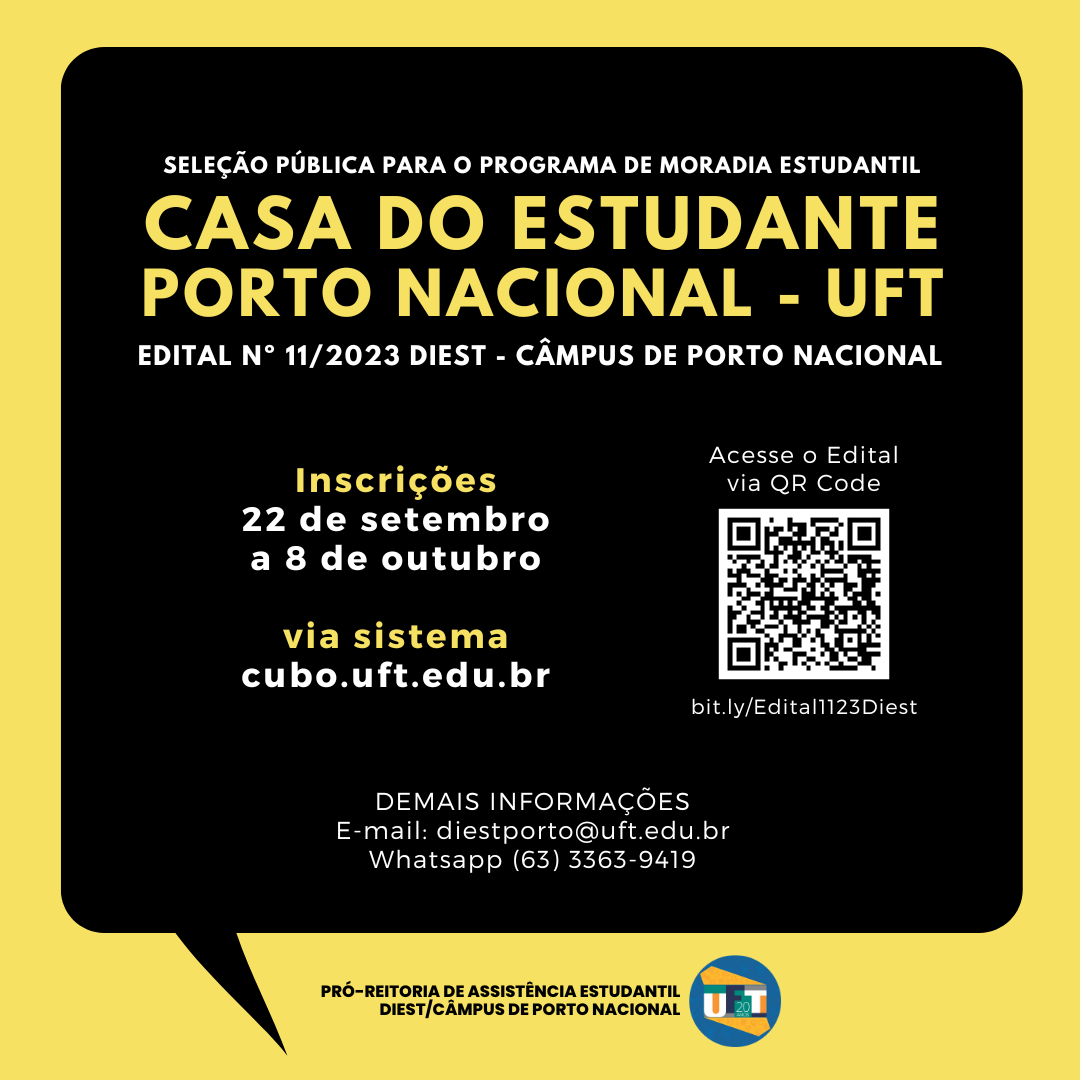 A Universidade Federal do Tocantins (UFT) por meio da Pró-Reitoria de Assistência Estudantil (Proest) e da Divisão de Estágio e Assistência Estudantil (Diest) do Câmpus de Porto Nacional, sob acompanhamento da Comissão de Apoio Institucional da Casa dos Estudantes (Caice), tornou público, no dia 18 de setembro, o Edital de Seleção de Estudantes para o Programa de Moradia Estudantil (PME) – Casa do Estudante.