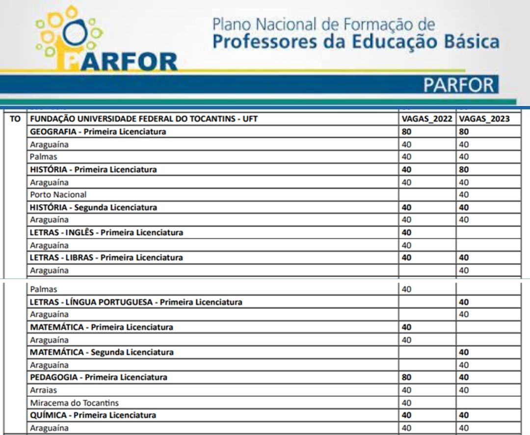 Os cursos ofertados incluem Geografia, História, Letras (Libras, Português e Língua Inglesa), Matemática, Pedagogia e Química divididos entre primeira e segunda graduação e serão ofertados nos câmpus de Araguaína, Palmas, Porto Nacional, Miracema e Arraias, conforme tabela abaixo.