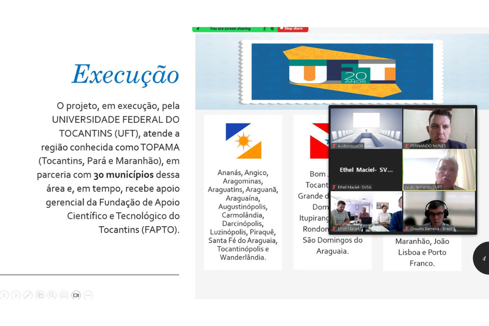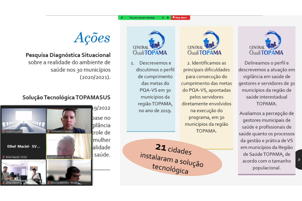 A equipe da Central de Qualificação das Ações de Vigilância em Saúde, Fortalecimento e Organização da Rede de Saúde Interfederativa - Rede TOPAMA (Qualitopama) se reuniu com representantes da Secretaria de Vigilância em Saúde e Ambiente (SVSA), para apresentar os resultados alcançados pelo projeto, ao longo dos anos de realização, no dia 7 de junho. A Central tem atuado, a partir dos termos de compromisso firmados, com 21 municípios, nos estados do Tocantins, Pará e Maranhão, região conhecida como TOPAMA.