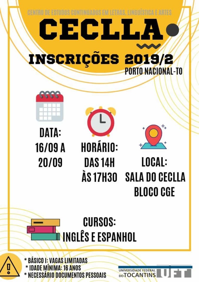 Entre os dias 16 e 20 de setembro, estarão abertas as inscrições para os cursos de Inglês e Espanhol, do Centro de Estudos Continuados em Letras, Linguística e Artes (Ceclla), no Câmpus de Porto Nacional. Os estudantes interessados deverão se encaminhar ao primeiro andar do Bloco CGE, na sala do Ceclla.