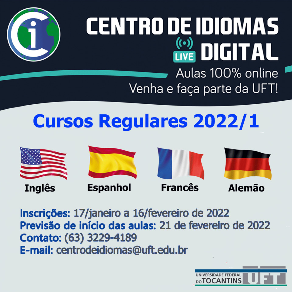O Centro de Idiomas da UFT está com inscrições abertas para Cursos Regulares - 2022/1. Os cursos estão disponíveis para todo o Tocantins e Brasil, com aulas 100% online de inglês, espanhol, francês e alemão.