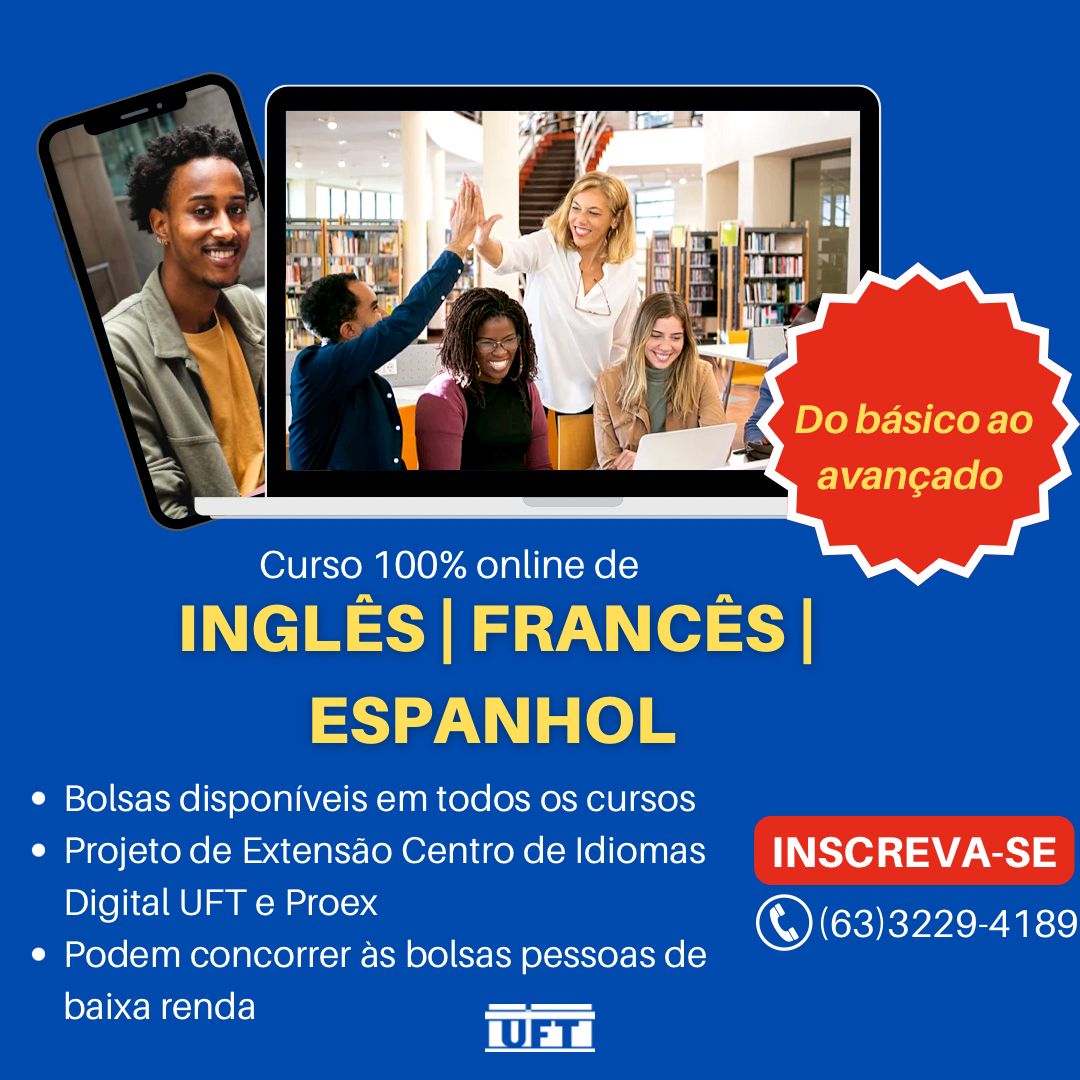 O Centro de Idiomas (CI) Digital da UFT, em parceria com a Pró-Reitoria de Extensão, Cultura e Assuntos Comunitários (Proex), está ofertando bolsas de 100% em todas as suas turmas de Inglês, Francês e Espanhol. Podem concorrer às bolsas pessoas de baixa renda, a partir dos 12 anos de idade, da comunidade interna ou externa. Mais informações pelo telefone (63) 3229-4189 ou e-mail: centrodeidiomas@uft.edu.br.