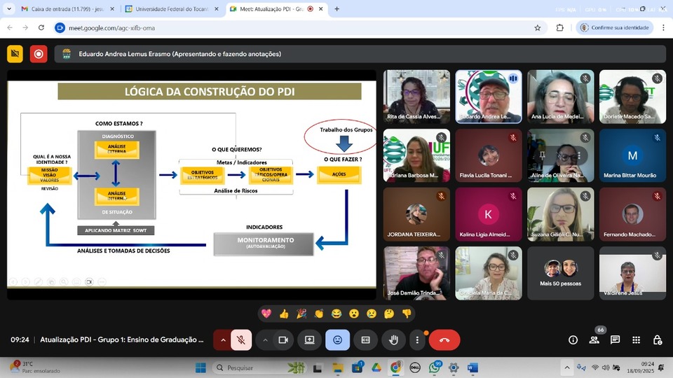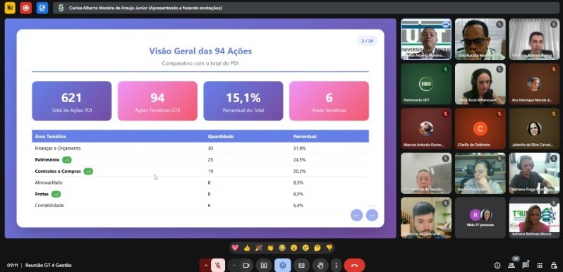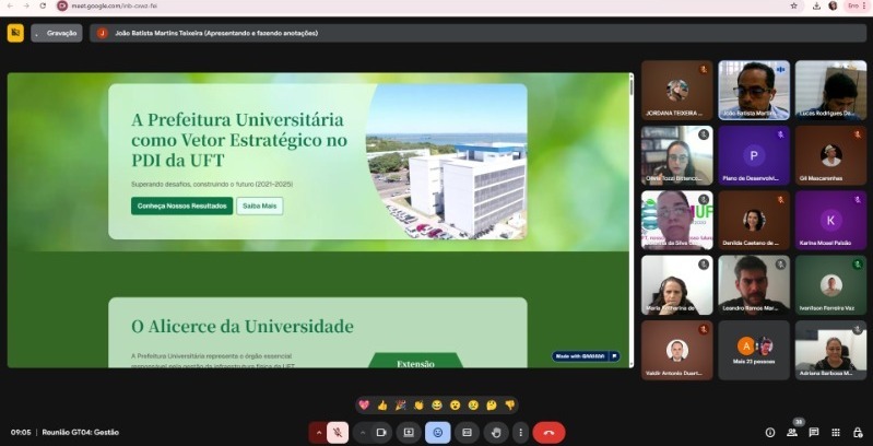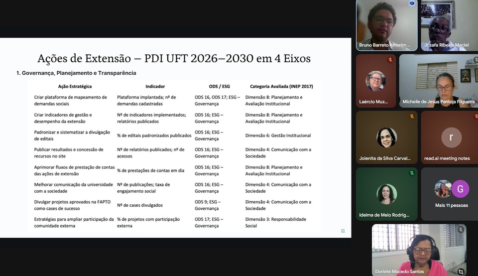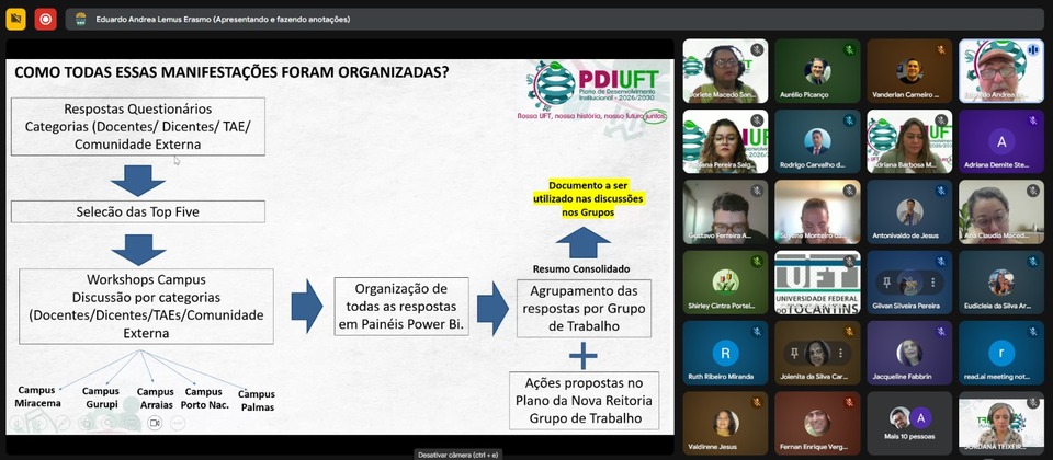 Entre os dias 5 de setembro e 10 de outubro de 2025, a Universidade Federal do Tocantins (UFT) realizou o ciclo de reuniões remotas para a construção das ações estratégicas do Plano de Desenvolvimento Institucional (PDI) 2026–2030. A iniciativa contou com a participação produtiva de 513 pessoas, entre docentes, técnicos, estudantes e gestores(as), organizados em cinco Grupos de Trabalho (GTs) temáticos.