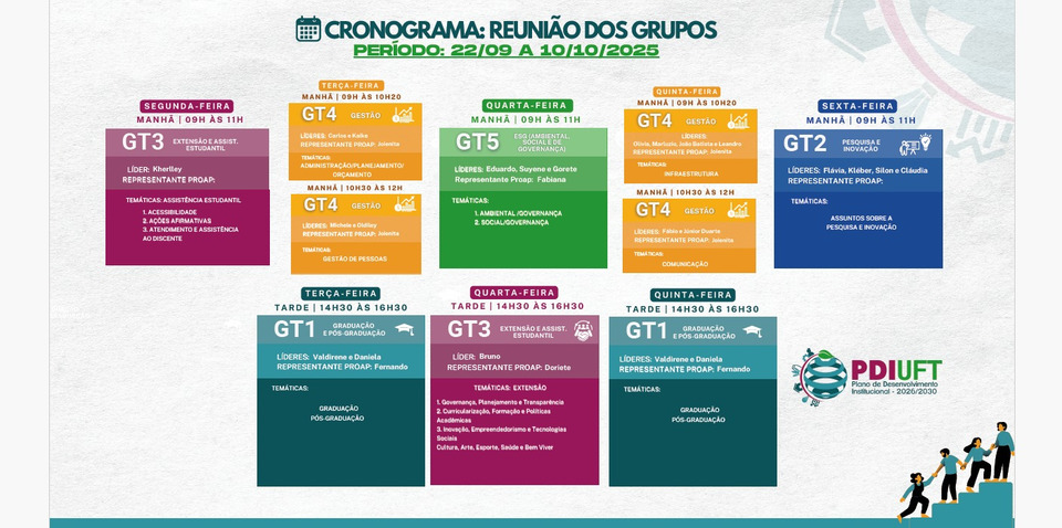 A diversidade de temas tratados e o comprometimento dos participantes deram o tom da construção coletiva que marca essa etapa do PDI. Agora, a próxima fase consiste na sistematização e compilação das propostas elaboradas pelos GTs em articulação com a Pró-Reitoria de Administração e Planejamento (Proap) e as Unidades Gestoras da UFT.