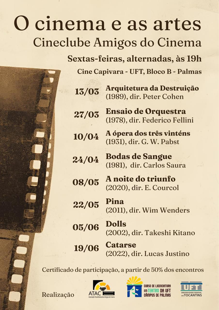 O Cineclube Amigos do Cinema realiza, na Universidade Federal do Tocantins (UFT), a Mostra “O cinema e as artes”, com exibições de filmes que dialogam com diferentes linguagens artísticas. As sessões ocorrem às sextas-feiras, de forma alternada e sempre às 19h, no Cine Capivara, Bloco B, no Câmpus de Palmas.
