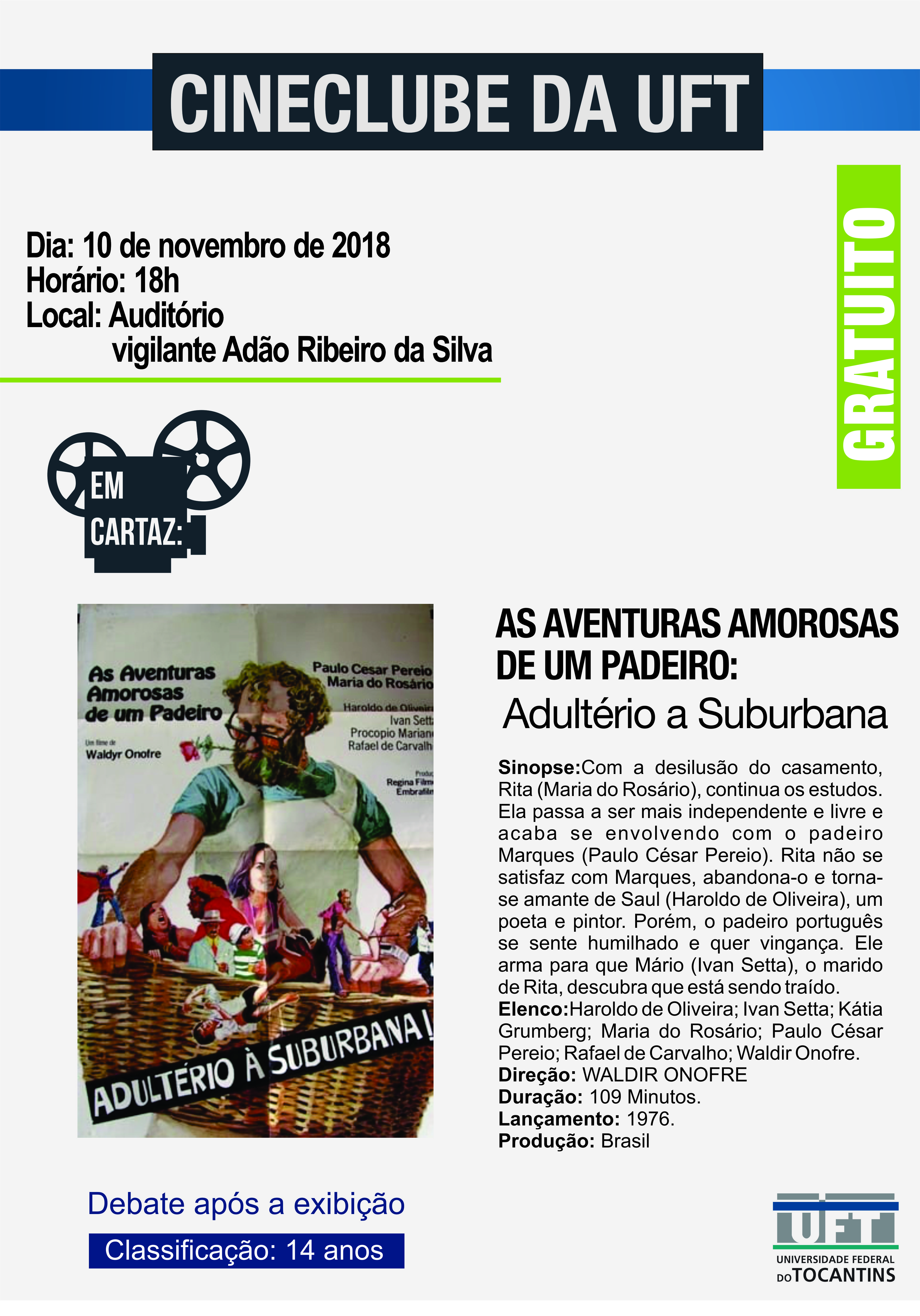 O projeto de extensão Cineclube, do Câmpus da UFT em Tocantinópolis, continua com a sua programação em 2018. O projeto exibirá o filme “As aventuras amorosas de um padeiro: adultério à suburbana” no próximo sábado (10), às 18 horas, no auditório Vigilante Adão Ribeiro da Silva. Após a exibição ocorrerá o tradicional debate com os presentes.