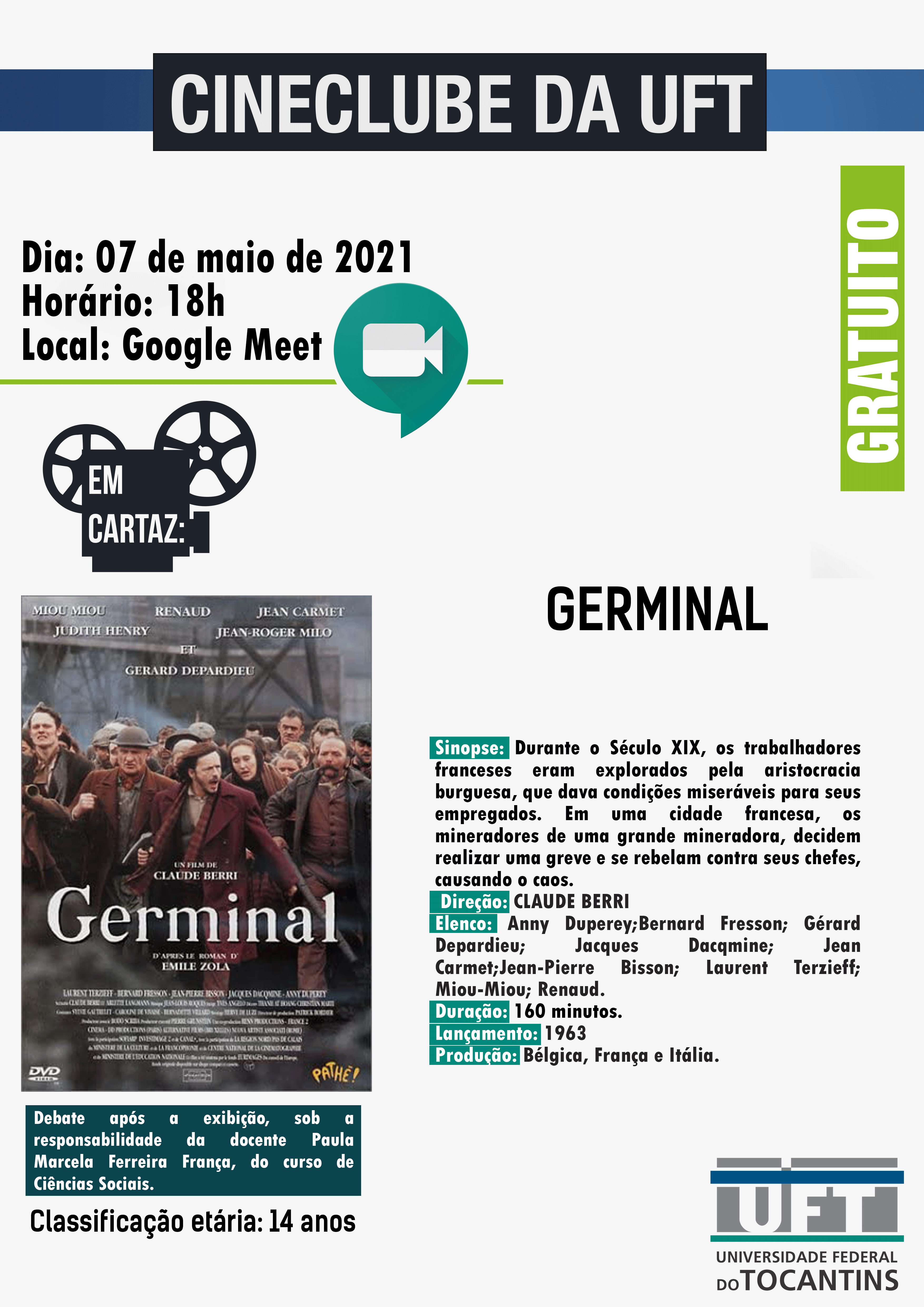 A programação virtual do Cineclube, do Câmpus da UFT em Tocantinópolis, segue com a exibição do filme "Germinal" - com direção de Claude Berri - coordenada pela professora de Ciências Sociais, Paula Marcela Ferreira França. A atividade acontecerá nesta sexta-feira (07), na plataforma Google Meet.