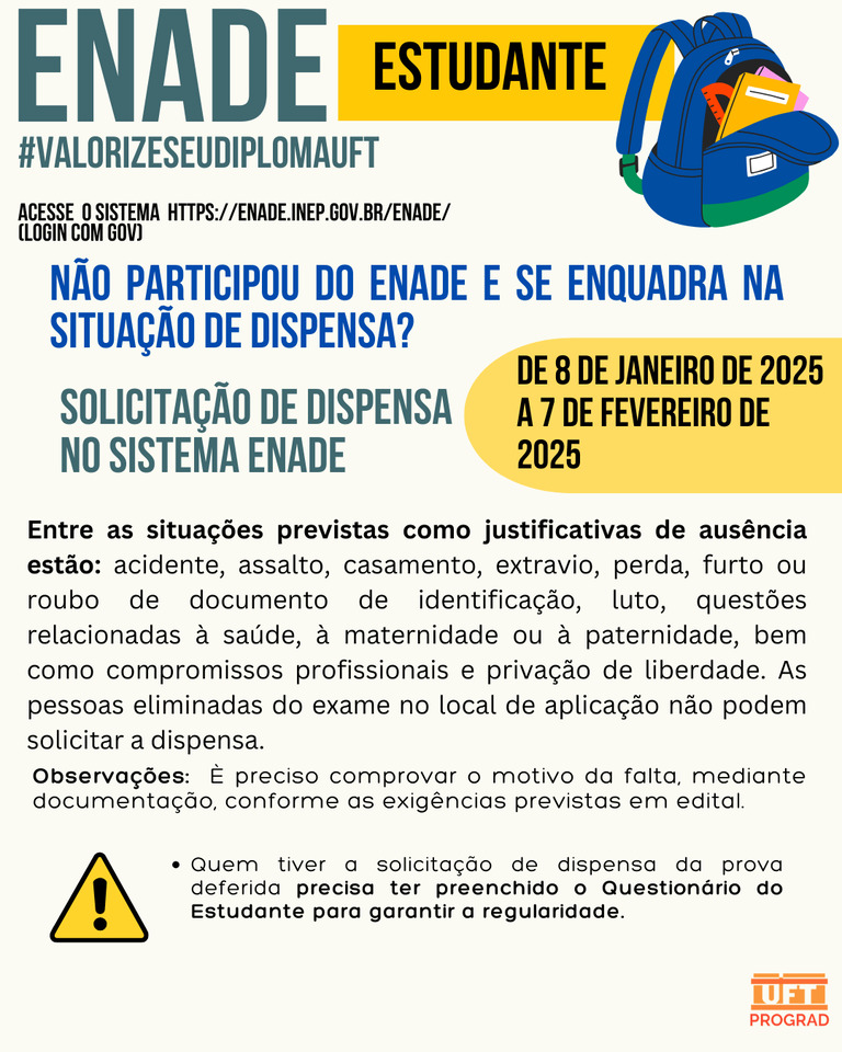 Começou, nesta quarta-feira, 8 de janeiro, o prazo para solicitar a dispensa da prova do Exame Nacional de Desempenho dos Estudantes (Enade) 2024. O pedido deve ser feito até o dia 7 de fevereiro, por meio do Sistema Enade, pelo estudante ou pela instituição de educação superior, a depender da motivação da ausência. Nas duas situações, é preciso comprovar o motivo da falta, mediante documentação, conforme as exigências previstas em edital.