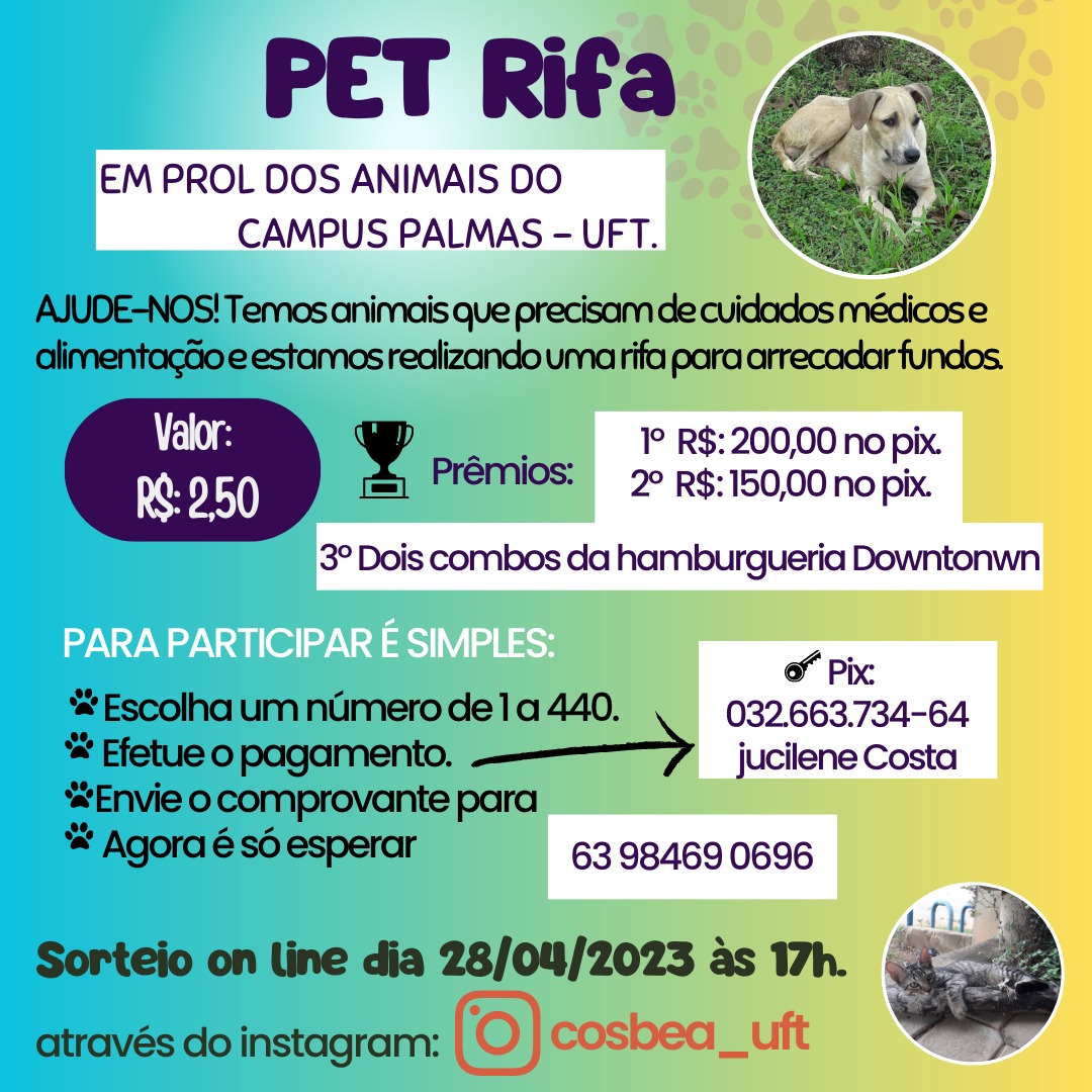 A Comissão de Saúde e Bem-Estar Animal (Cosbea), do Câmpus de Palmas, está promovendo uma “pet rifa” em prol dos animais abandonados do Câmpus, que precisam de cuidados médicos e alimentação.