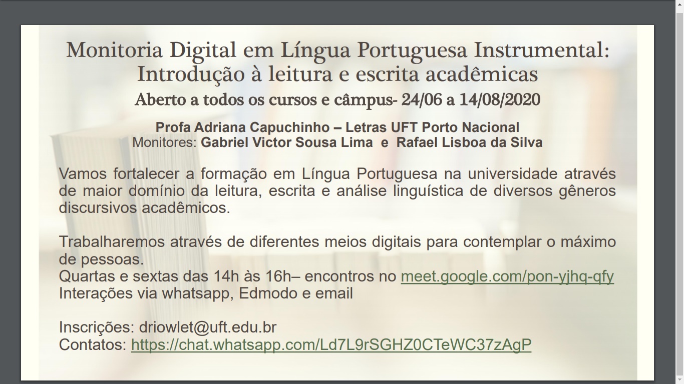 Tem início na quarta-feira, a partir do Câmpus de Porto Nacional, o curso "Monitoria Digital em Língua Portuguesa Instrumental: introdução à leitura e escrita acadêmicas". A atividade será desenvolvida pela professora de Letras Adriana Capuchinho, e vai ocorrer de 24 de junho até 14 de agosto de 2020. É aberto a todas as graduações e câmpus e totalmente virtual.