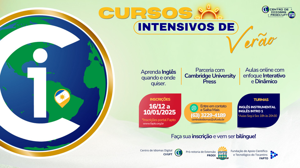 O Centro de Idiomas da Universidade Federal do Tocantins (UFT) anunciou a abertura de inscrições para cursos intensivos de inglês, que ocorrerão em janeiro de 2025. Os interessados podem se inscrever até o dia 10 de janeiro, exclusivamente pelo site da Fapto.