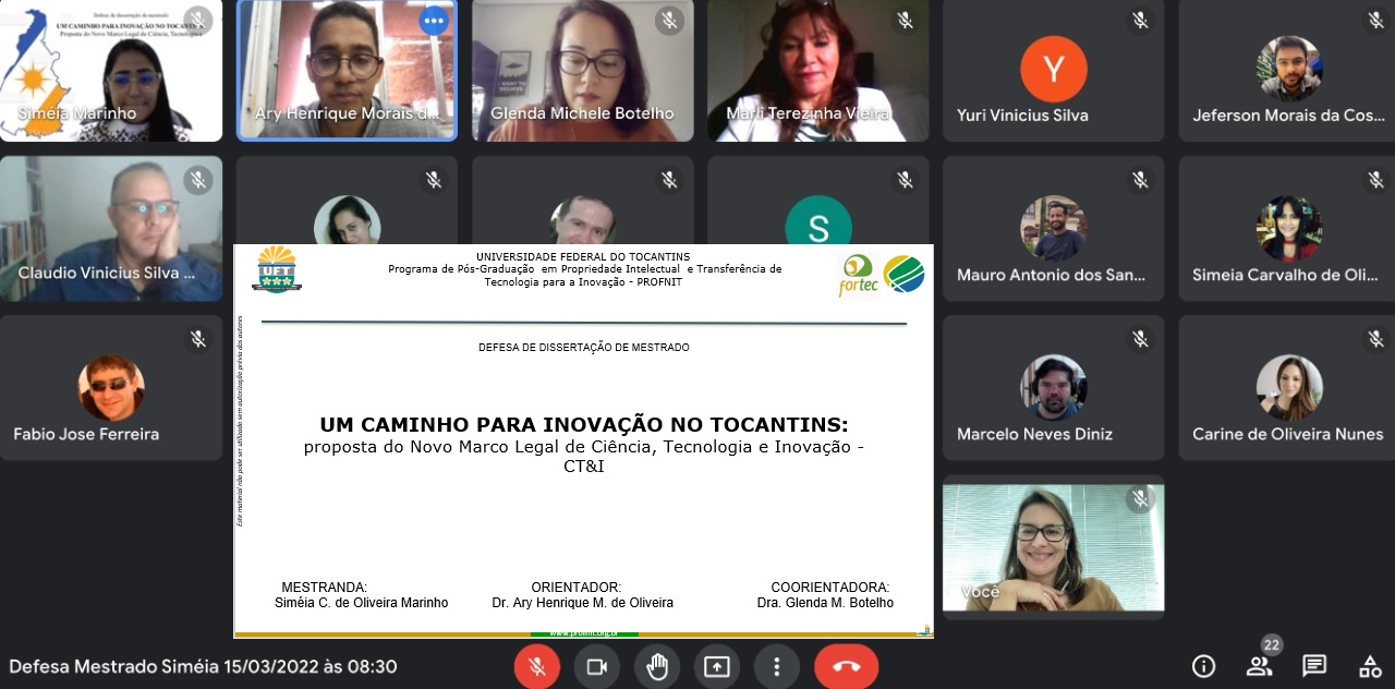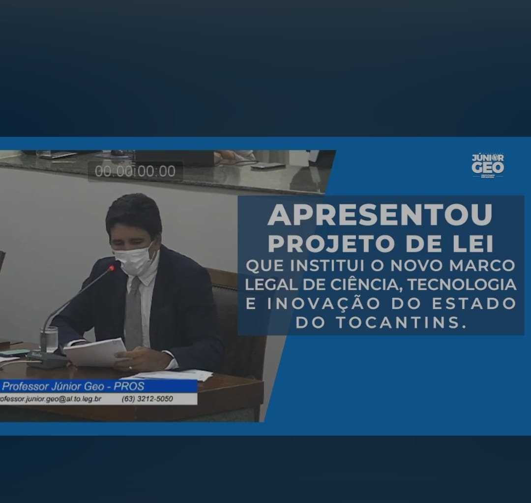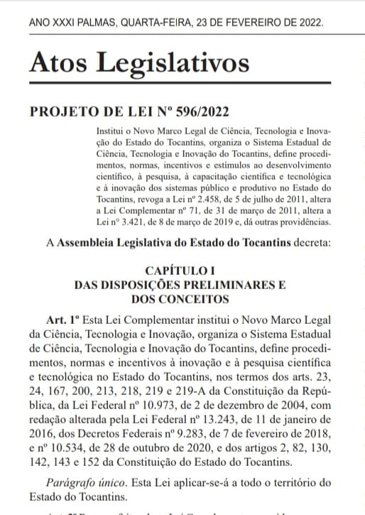 O Projeto de Lei nº. 596/2022, que tem por objetivo instituir o "Novo Marco Legal de Ciência, Tecnologia e Inovação do Estado do Tocantins", é fruto de projeto de pesquisa desenvolvido pela mestranda Siméia Carvalho de Oliveira Marinho, do Programa de Mestrado em Propriedade Intelectual e Transferência de Tecnologia para Inovação (Profnit), pela Universidade Federal do Tocantins (UFT), juntamente com o orientador, professor Ary Henrique Morais de Oliveira e a coorientadora professora Glenda Michele Botelho.
