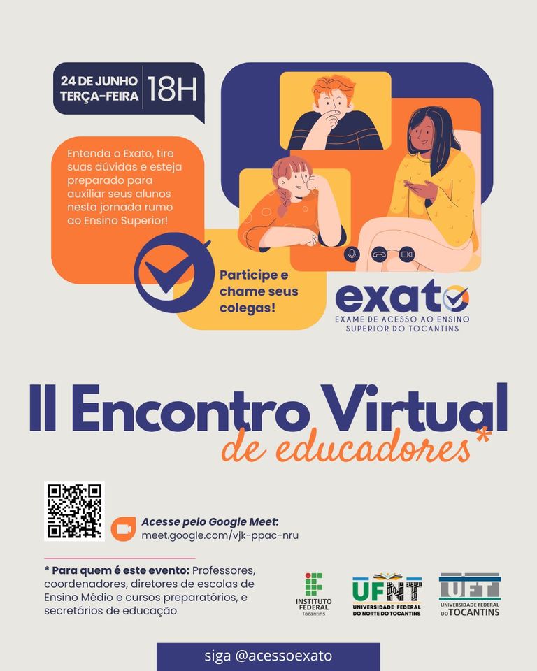 A coordenação do Exame de Acesso ao Ensino Superior do Tocantins (Exato) realiza no próximo dia 24 de junho a segunda edição do Encontro Virtual de Educadores sobre o Exato. A primeira edição, realizada em março, teve 70 participantes de diversas cidades do estado, e a expectativa agora é de uma adesão ainda maior.