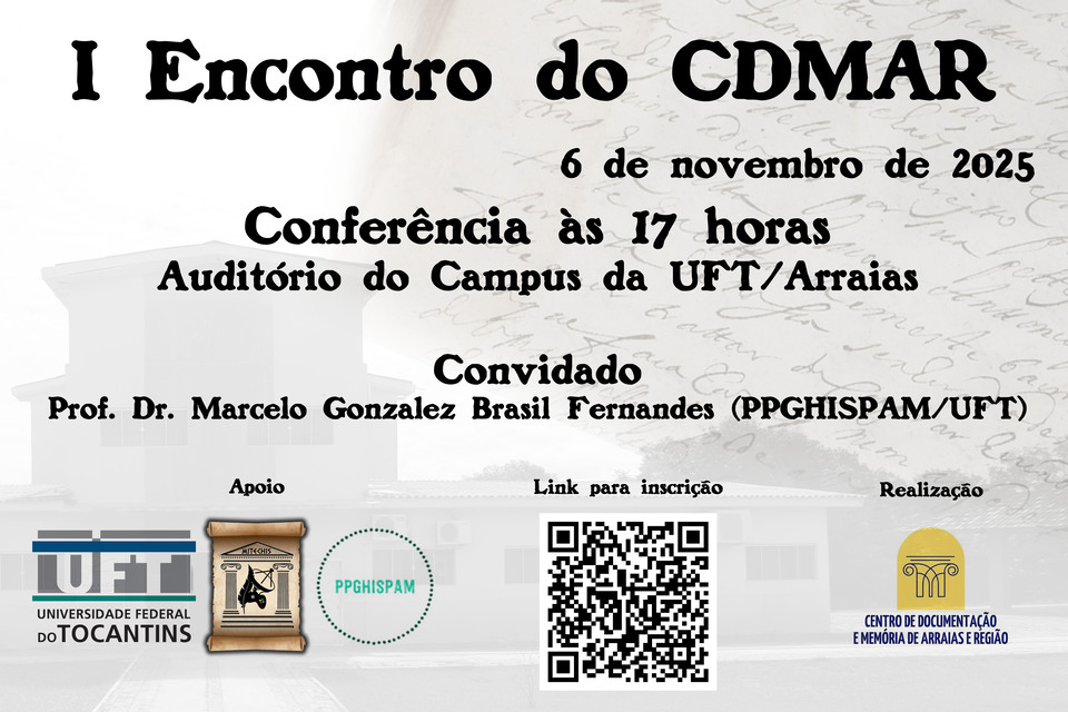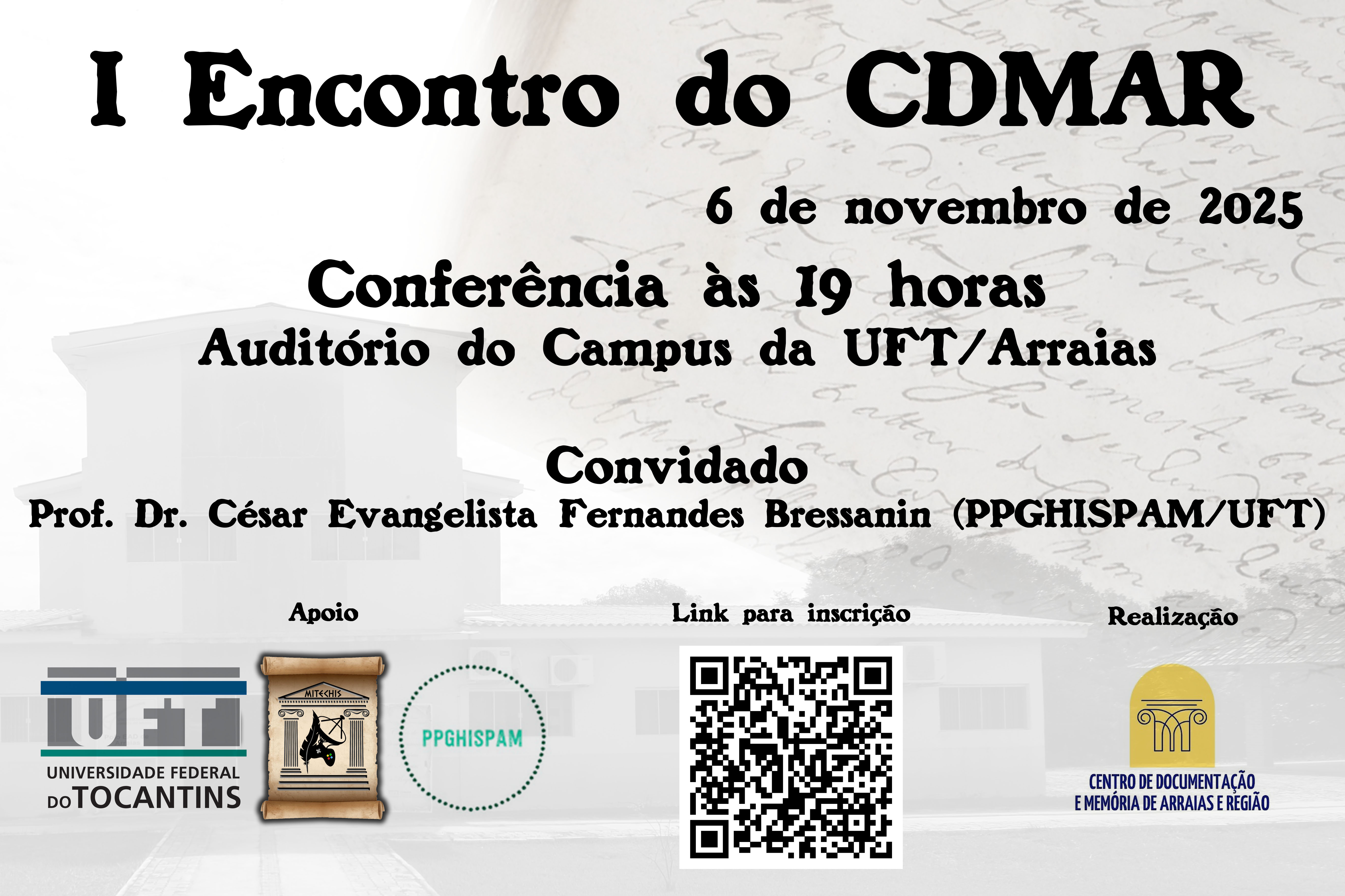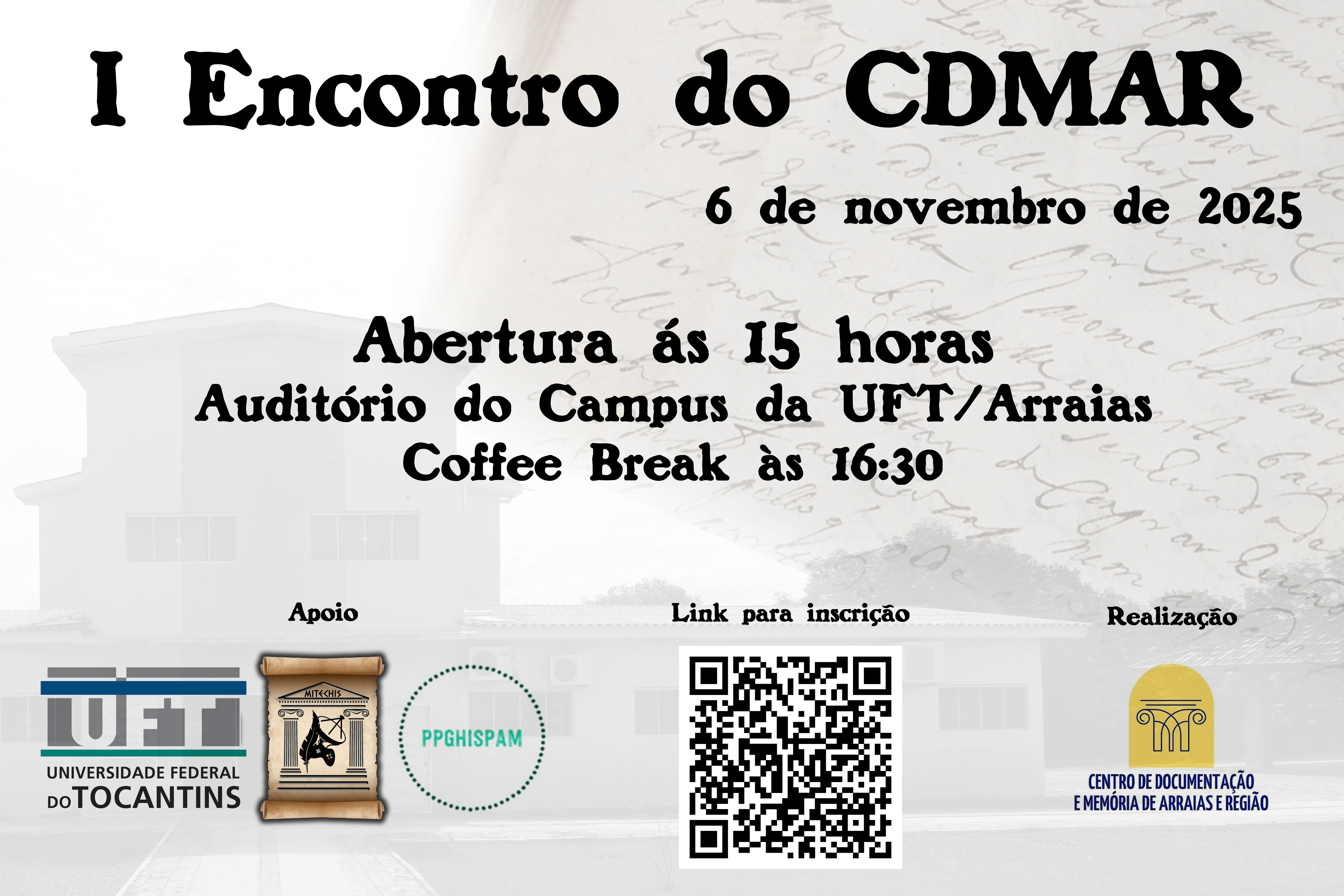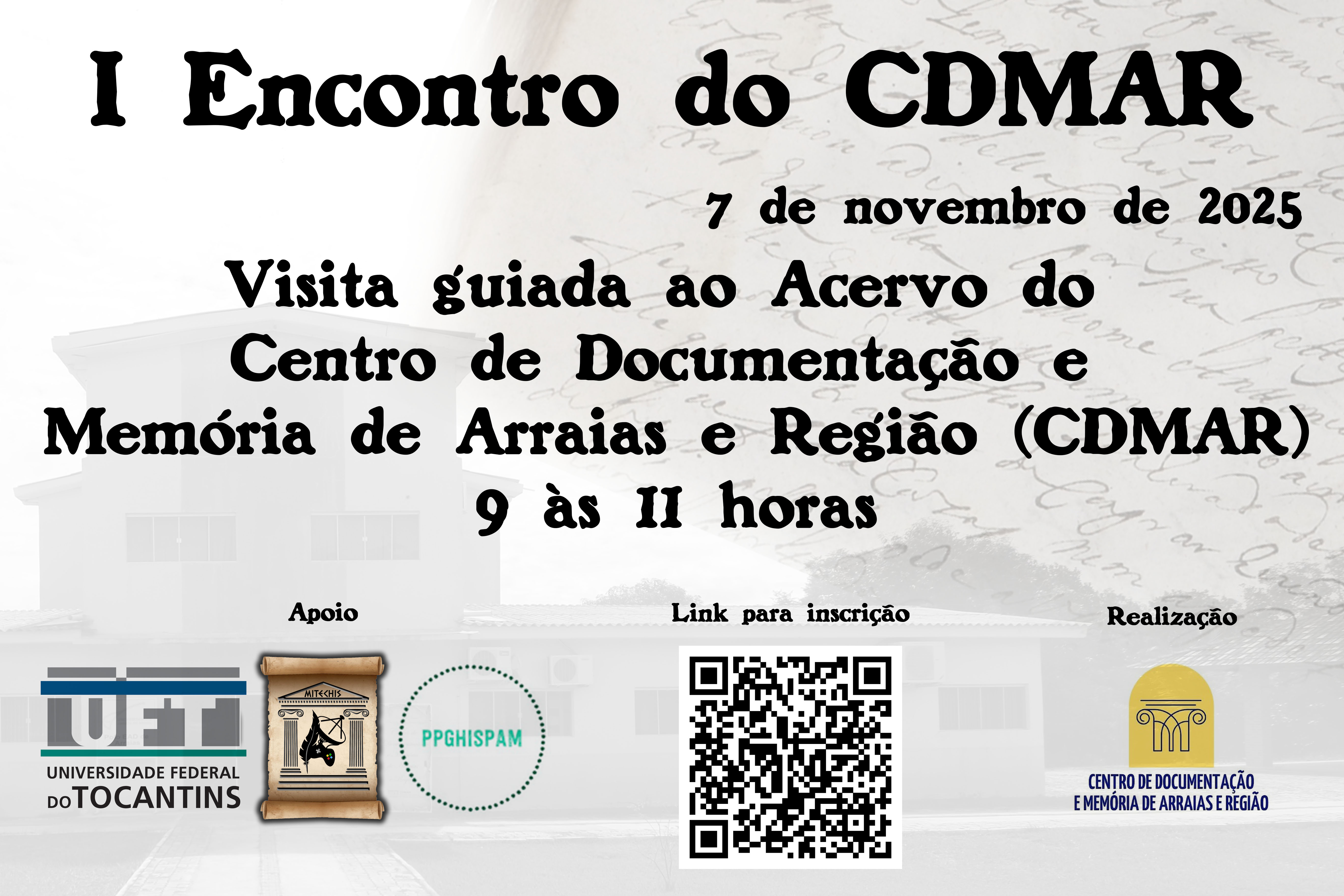 O Centro de Documentação e Memória de Arraias e Região (Cdmar) realizará, nos dias 6 e 7 de novembro de 2025, o I Encontro do Cdmar, no Câmpus de Arraias. O evento, aberto ao público, será dedicado à história, cultura e memória da região, com conferências, apresentações de pesquisas e certificação de 16 horas para os participantes.
