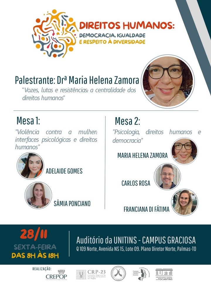 O Conselho Regional de Psicologia 23ª Região (CRP-23), por meio do Centro de Referências Técnicas em Psicologia e Políticas Públicas (Crepop) e em parceria com a Escola Superior da Magistratura Tocantinense (Esmat), realiza, com a participação da comunidade acadêmica e da sociedade civil, o Encontro sobre Direitos Humanos 2025, nesta sexta-feira, 28 de novembro, no auditório da Unitins, Câmpus Graciosa. Os cursos da UFT de Psicologia (graduação) e o de mestrado em Prestação Jurisdicional e Direitos Humanos (PPGPJDH) também estão presentes na realização do evento.