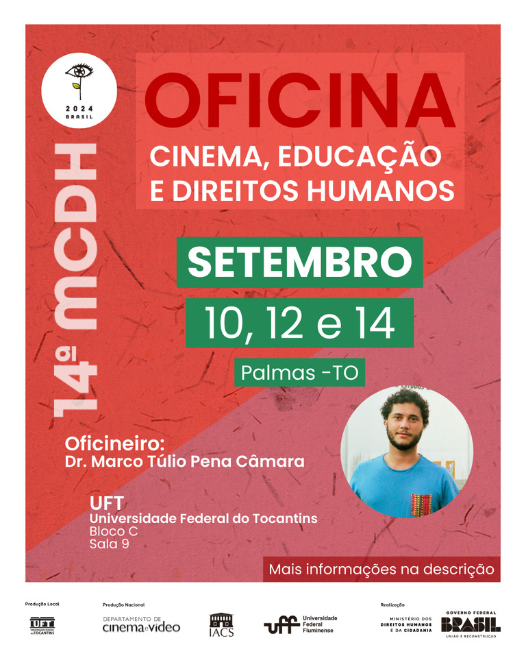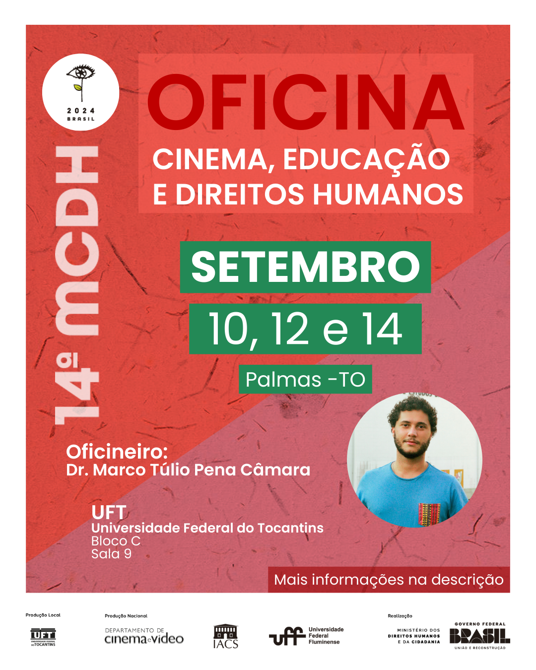 A Oficina de Cinema, Educação e Direitos Humanos será realizada nos dias 10, 12 e 14 de setembro, na sala 9 (auditório) do bloco C, da Universidade Federal do Tocantins (UFT). A oficina faz parte da programação da 14ª Mostra Cinema e Direitos Humanos e nasce da metodologia do projeto “Inventar com a Diferença”, desenvolvido pelo Laboratório Kumã, da Universidade Federal Fluminense (UFF).