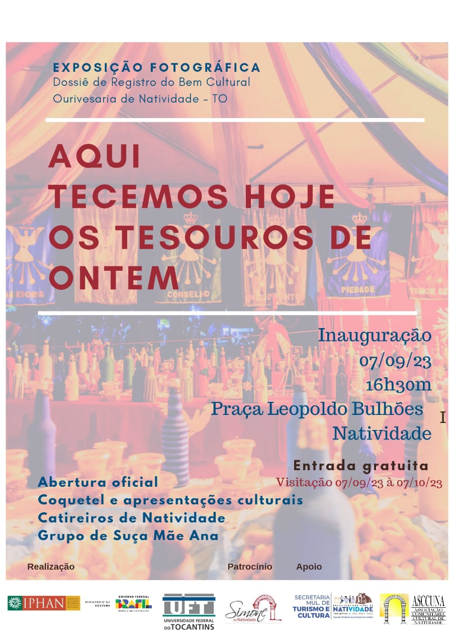 No feriado de 7 de setembro será lançada em Natividade/TO a exposição "Aqui tecemos hoje os tesouros de ontem", às 16h30. A exposição estará aberta ao público na Praça Leopoldo Bulhões até o dia 7 de outubro. A iniciativa é parte da pesquisa do dossiê para registro das joias artesanais de Natividade como patrimônio cultural.