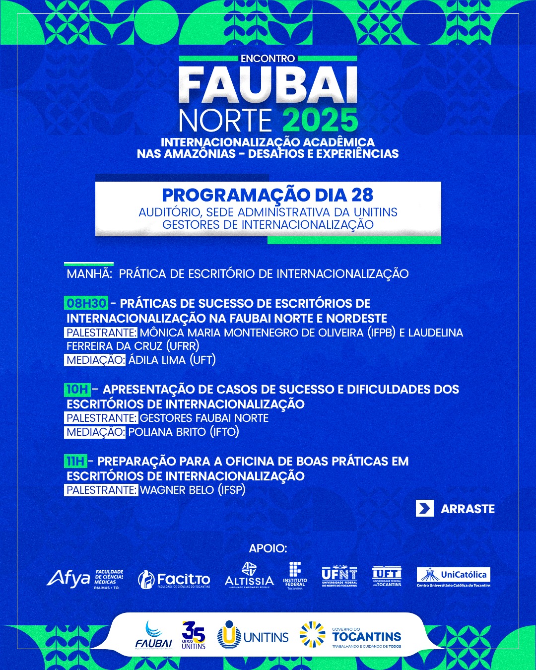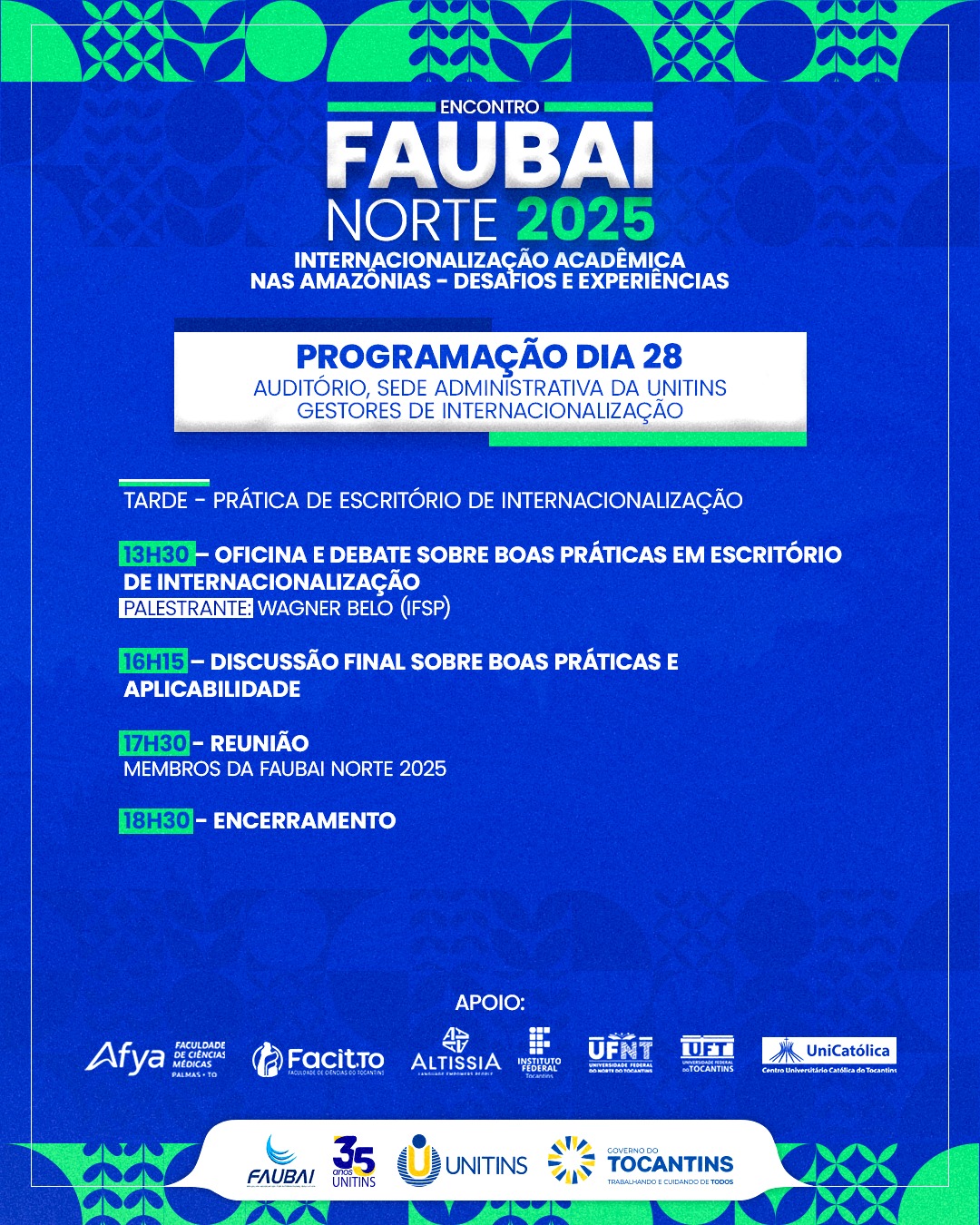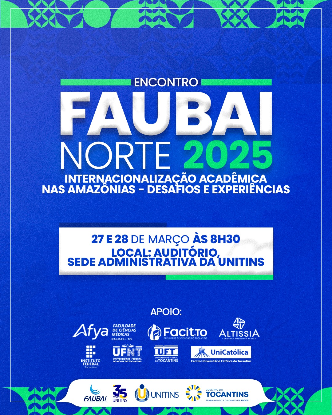 Nos dias 27 e 28 de março, ocorre o encontro Faubai Norte 2025. O evento terá como tema “Internacionalização Acadêmica nas Amazônias - Desafios e Experiências”. O evento será sediado pela Universidade Estadual do Tocantins (Unitins), representante da Associação Brasileira de Educação Internacional (Faubai), em parceria com UFT. Esse programa tem como foco na construção de estratégias para a internacionalização no Norte do Brasil. No dia 27, o evento será aberto ao público em geral na Sede Administrativa da Unitins, em Palmas, com discussões sobre a internacionalização na Amazônia. Já no dia 28, será voltado à capacitação de gestores, promovendo estratégias para a prática da internacionalização.
