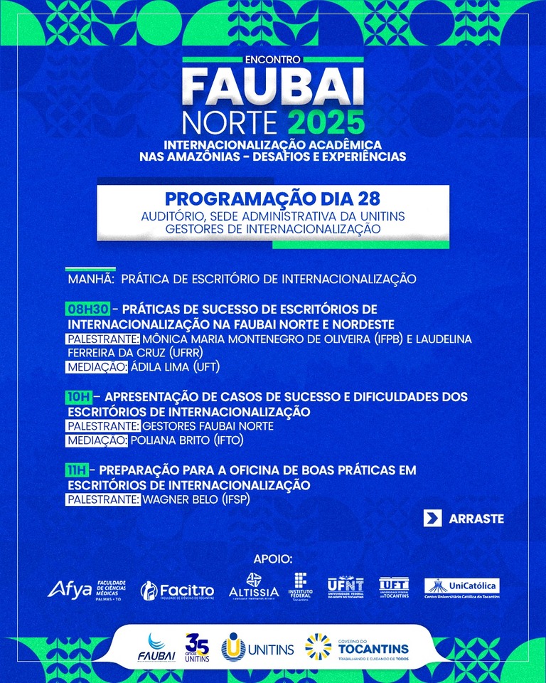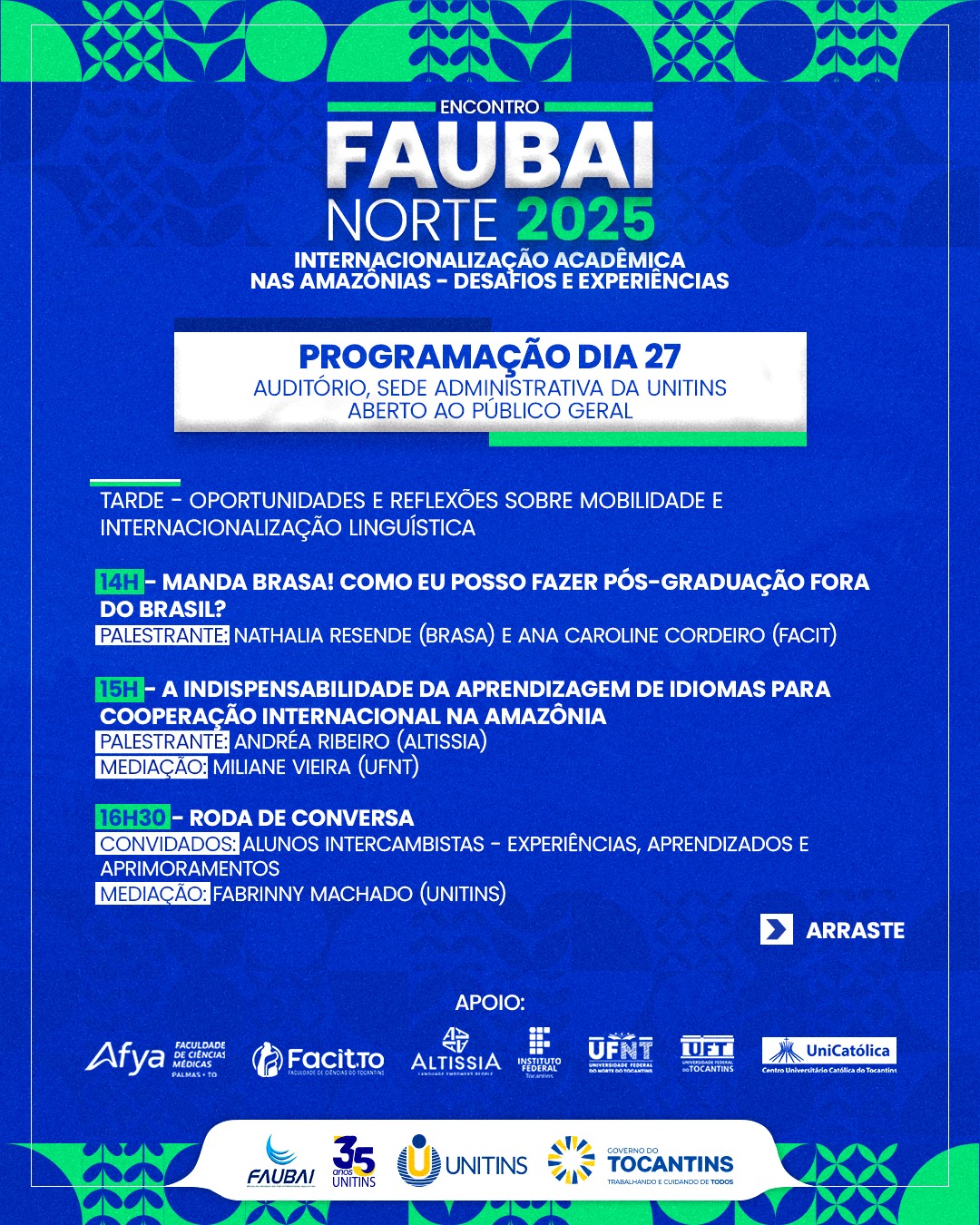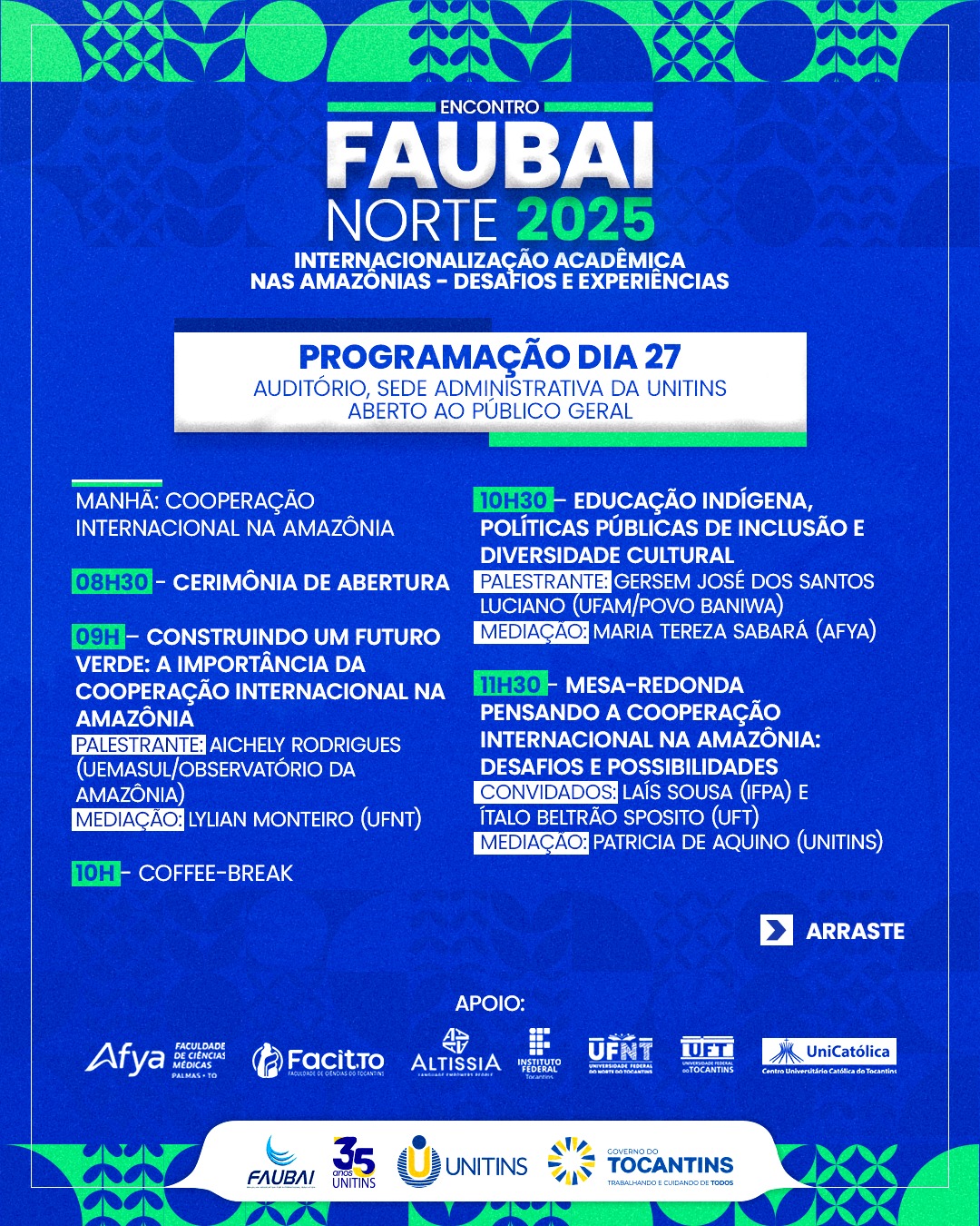 Nos dias 27 e 28 de março, ocorre o encontro Faubai Norte 2025. O evento terá como tema “Internacionalização Acadêmica nas Amazônias - Desafios e Experiências”. O evento será sediado pela Universidade Estadual do Tocantins (Unitins), representante da Associação Brasileira de Educação Internacional (Faubai), em parceria com UFT. Esse programa tem como foco na construção de estratégias para a internacionalização no Norte do Brasil. No dia 27, o evento será aberto ao público em geral na Sede Administrativa da Unitins, em Palmas, com discussões sobre a internacionalização na Amazônia. Já no dia 28, será voltado à capacitação de gestores, promovendo estratégias para a prática da internacionalização.