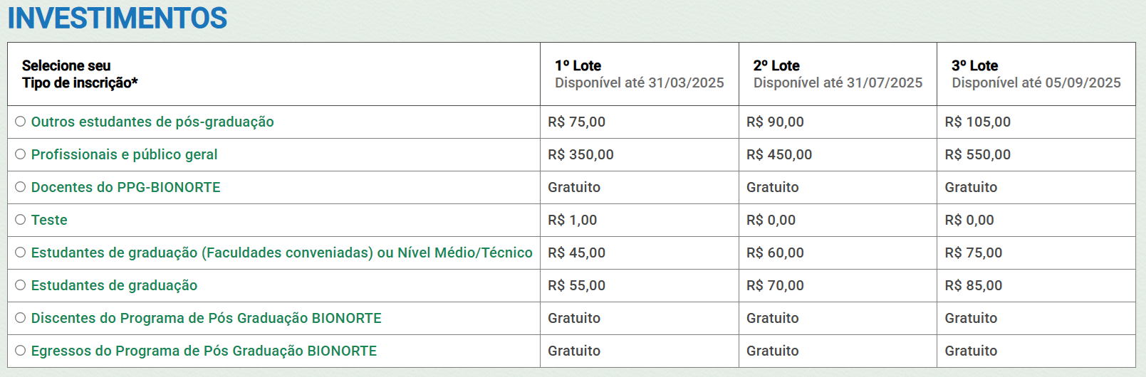 O prazo para submissão de trabalhos científicos é até 30 de junho de 2025. As regras estão disponíveis no site oficial do congresso: www.cbbba25.com.br, onde também é possível conferir toda a programação, a vitrine tecnológica e a área para inscrição. Confira abaixo os valores dos investimentos divulgados por meio do site:
