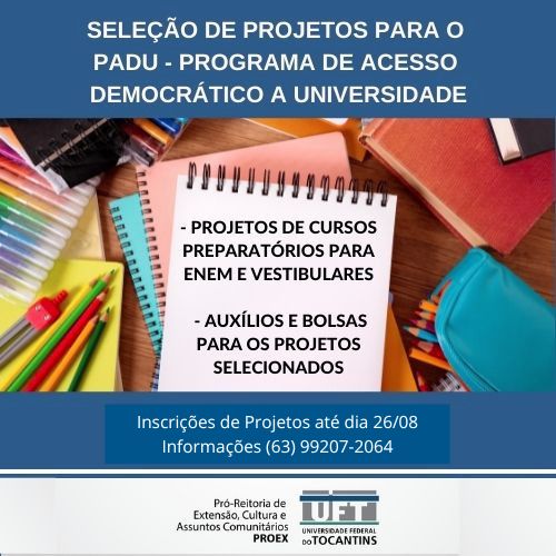 Estão abertas as inscrições para seleção de projetos para o Programa de Acesso Democrático à Universidade (Padu). O Padu tem como finalidade agregar cursos preparatórios aos vestibulares e ao Exame Nacional do Ensino Médio (Enem) nas unidades da UFT.