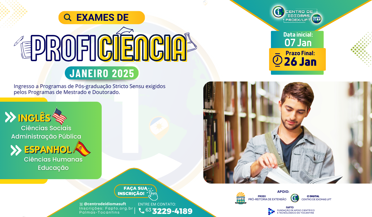 O Centro de Idiomas da Universidade Federal do Tocantins (UFT), Câmpus de Palmas, abre as inscrições até o dia 26 de janeiro para os interessados em fazer o exame de Proficiência em Leitura de Línguas Estrangeiras, conforme requisitado pelos programas de mestrado e doutorado. A prova será realizada de forma online e está prevista para o dia 30 de janeiro, no período vespertino, pelo portal da Fundação de Apoio Científico e Tecnológico do Tocantins (Fapto).