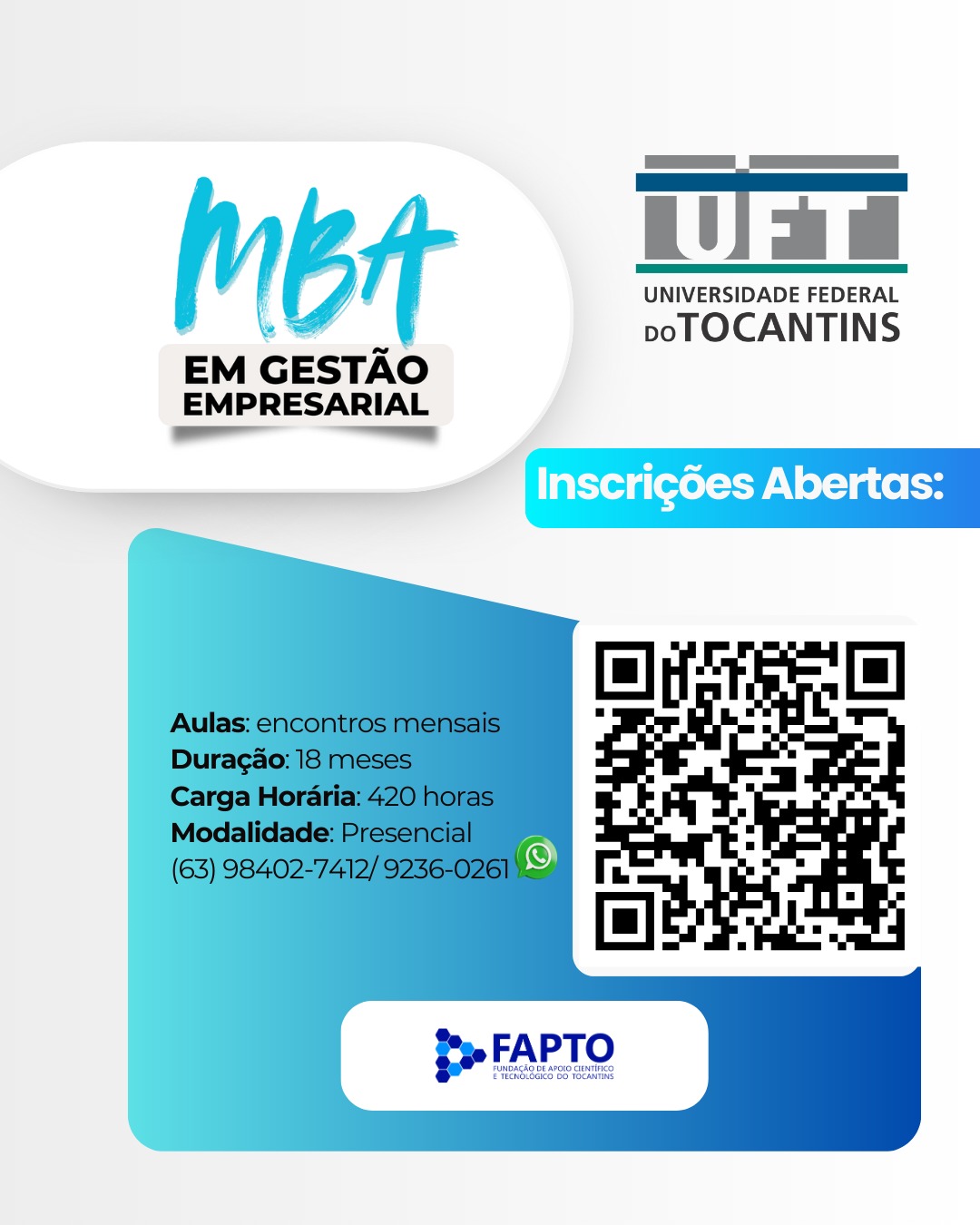 A Universidade Federal do Tocantins (UFT) está com inscrições abertas para o MBA em Gestão Empresarial, em Palmas. O curso é uma oportunidade para o profissional atualizar os principais conceitos em desenvolvimentos de habilidades gerenciais e estratégicas voltadas para os negócios.