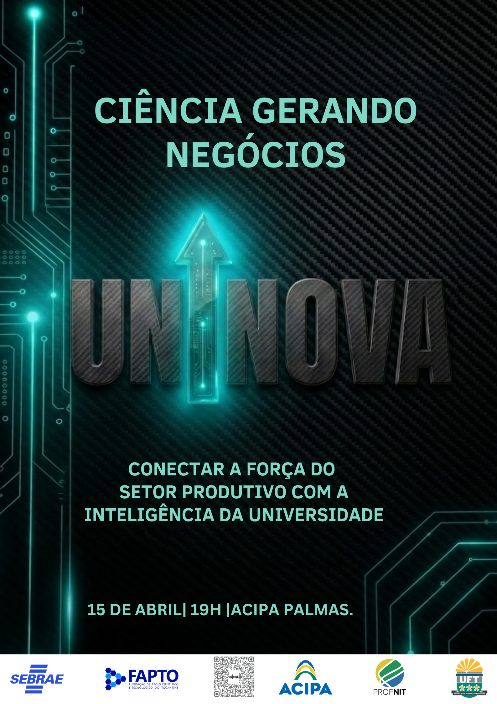 Mestrandos da turma 2026 do Programa de Pós-Graduação em Propriedade Intelectual e Transferência de Tecnologia para Inovação da UFT (Câmpus de Palmas) promovem, no dia 15 de abril, às 19h, no auditório da Associação Comercial e Industrial de Palmas (Acipa), a primeira edição do evento Ciência Gerando Negócios – Uninova.