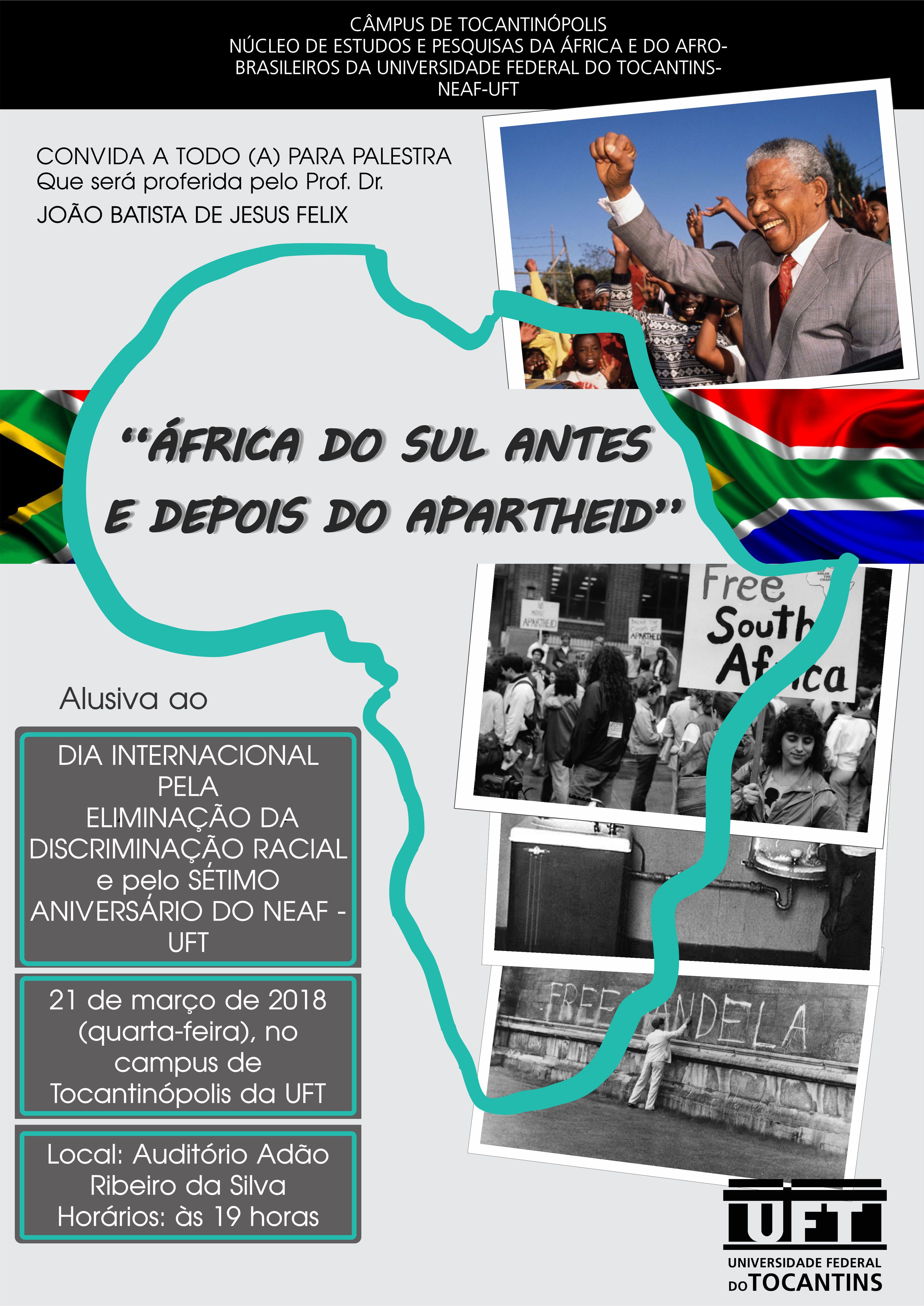 No dia em que se discute internacionalmente a luta contra a discriminação racial, próximo 21 de março, o Núcleo de Estudos e Pesquisas da África e dos Afro-Brasileiros da UFT (Neaf/UFT), no Câmpus de Tocantinópolis, promove a palestra "África do Sul Antes e Depois do Apartheid", ministrada pelo professor João Batista de Jesus Félix. O evento acontece às 19 horas, no Auditório Adão Ribeiro da Silva e é direcionado a todos os alunos, professores, técnicos e comunidade.