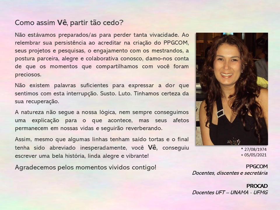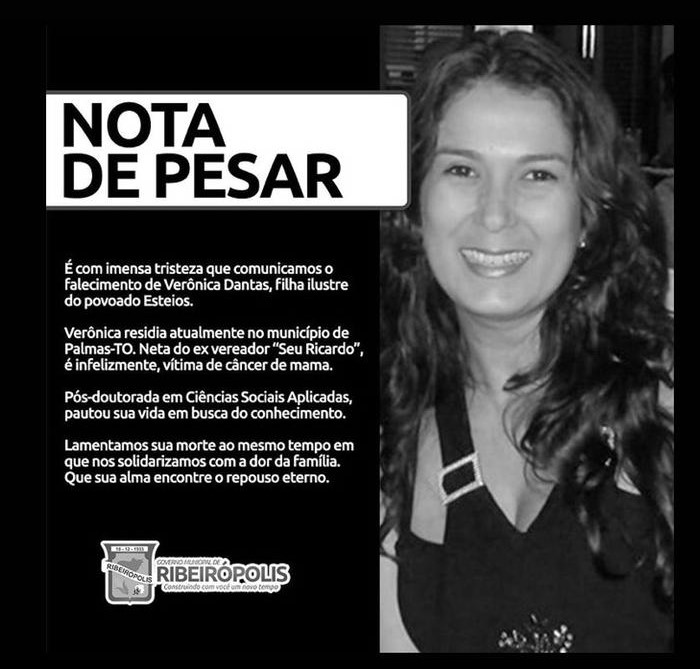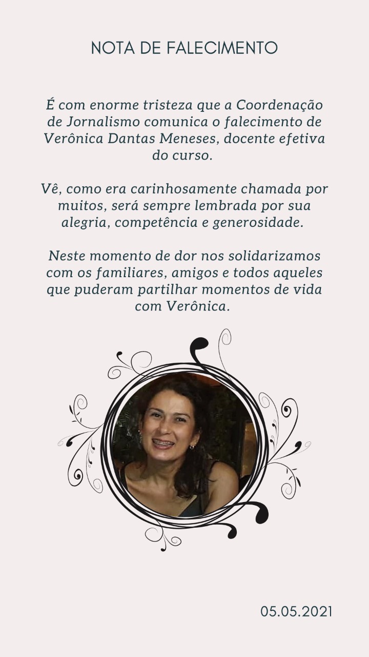 É com imenso pesar que a Universidade Federal do Tocantins (UFT) lamenta o falecimento da professora do curso de Jornalismo (Câmpus de Palmas), Verônica Dantas Meneses, 46 anos. Ela nos deixou nesta quarta-feira (5). O velório ocorrerá no povoado Esteios e o enterro será às 16 h no cemitério do povoado Serra do Machado, no município de Ribeirópolis (SE), sua terra natal.