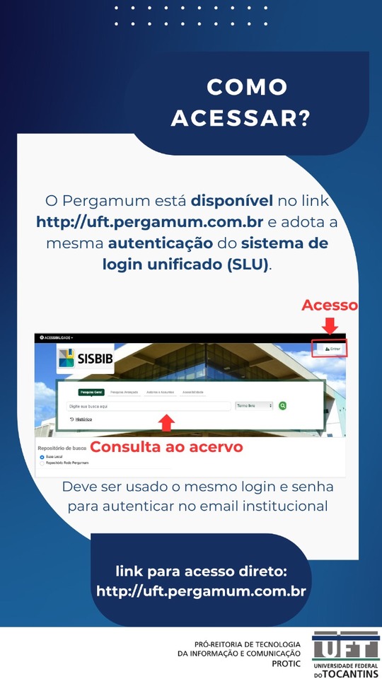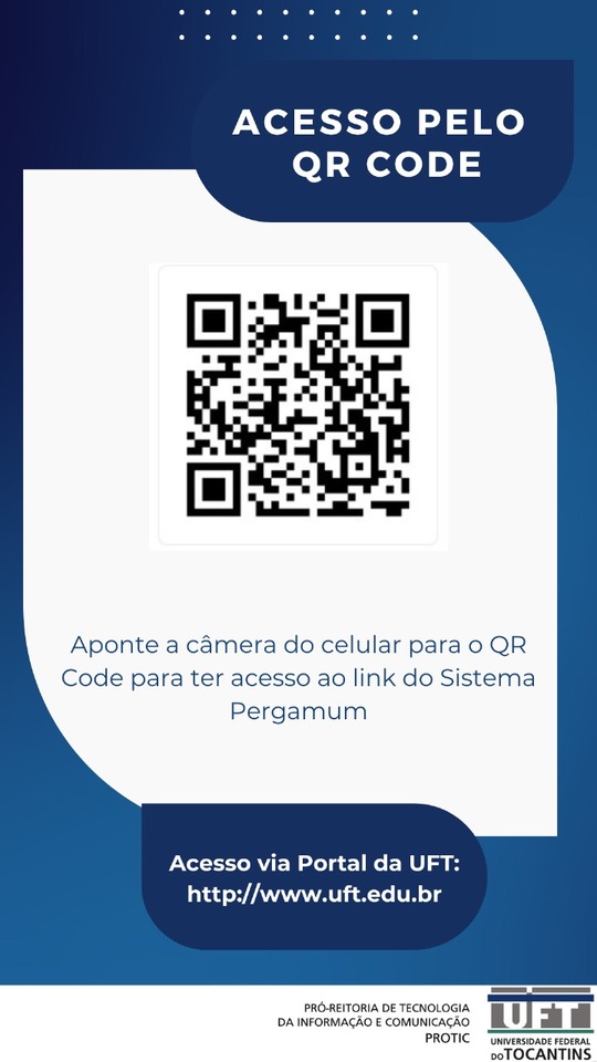 O acesso à plataforma será realizado a partir da área de Sistemas e Soluções Digitais no Portal de Informações da UFT ou pelo endereço do Sistema Pergamum. A autenticação utiliza o mesmo login e senha registrado no sistema de login unificado (SLU) da Universidade Federal do Tocantins.
