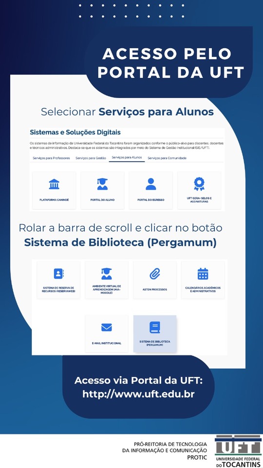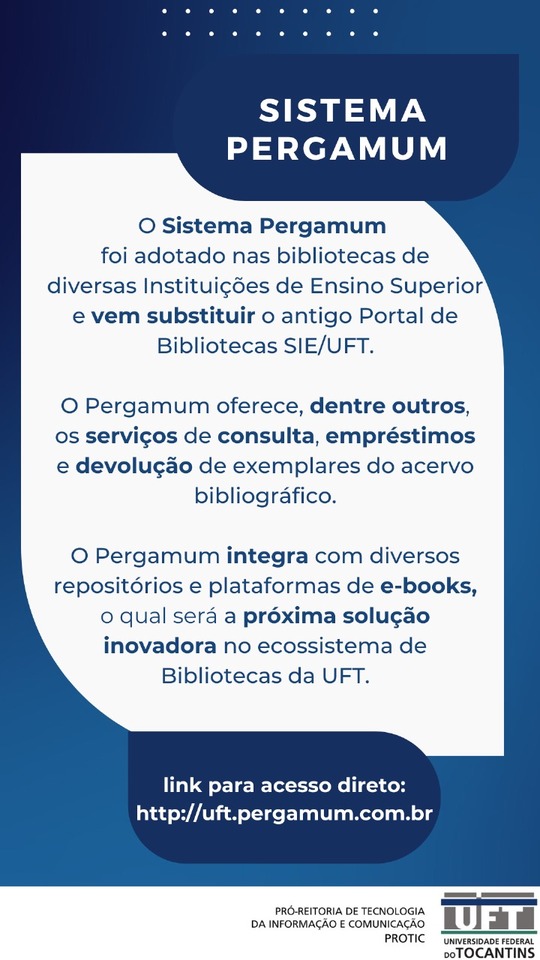 Desenvolvido pela Pontifícia Universidade Católica do Paraná, o sistema Pergamum é amplamente utilizado por diversas Instituições de Ensino Superior e vem em substituição ao antigo Portal de Bibliotecas da Universidade Federal do Tocantins que tem como base o Sistema de Informações de Ensino (SIE).