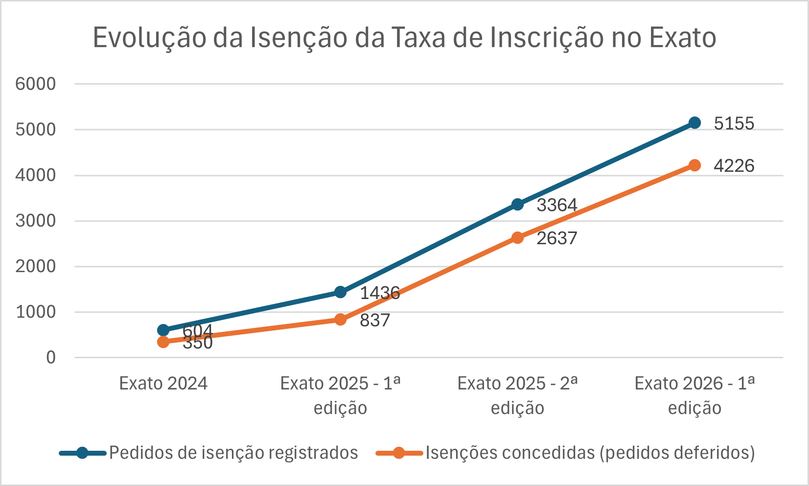 O número de estudantes beneficiados com isenção da taxa do Exato cresceu de 350 em 2024 para 4.226 em 2026. No mesmo período, a taxa de aprovação dos pedidos subiu de cerca de 58% para 82%, enquanto a procura pelo benefício aumentou mais de oito vezes.