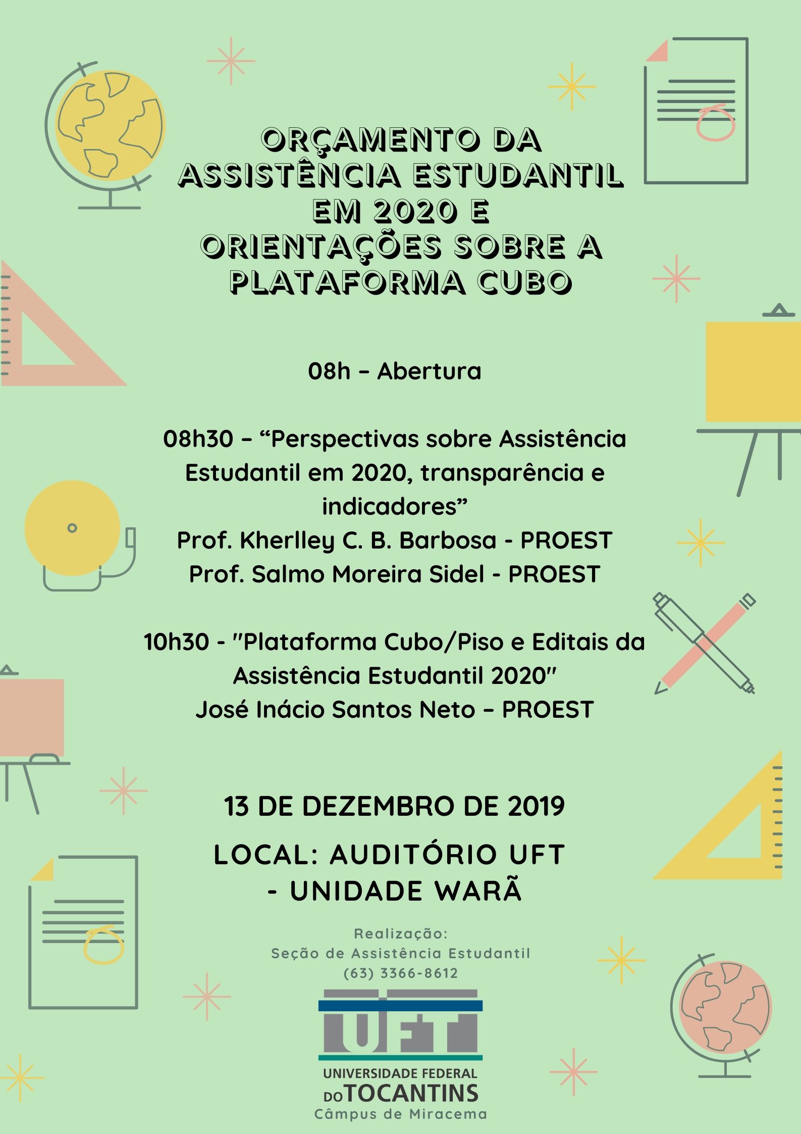 Será realizada, nesta sexta-feira (13), a mesa-redonda sobre "Orçamento da assistência estudantil em 2020 e orientações sobre a plataforma Cubo", no Câmpus de miracema. Ocorrerá a partir das 8h no Auditório da UFT, unidade Warã. É aberto a todos os acadêmicos do Câmpus.