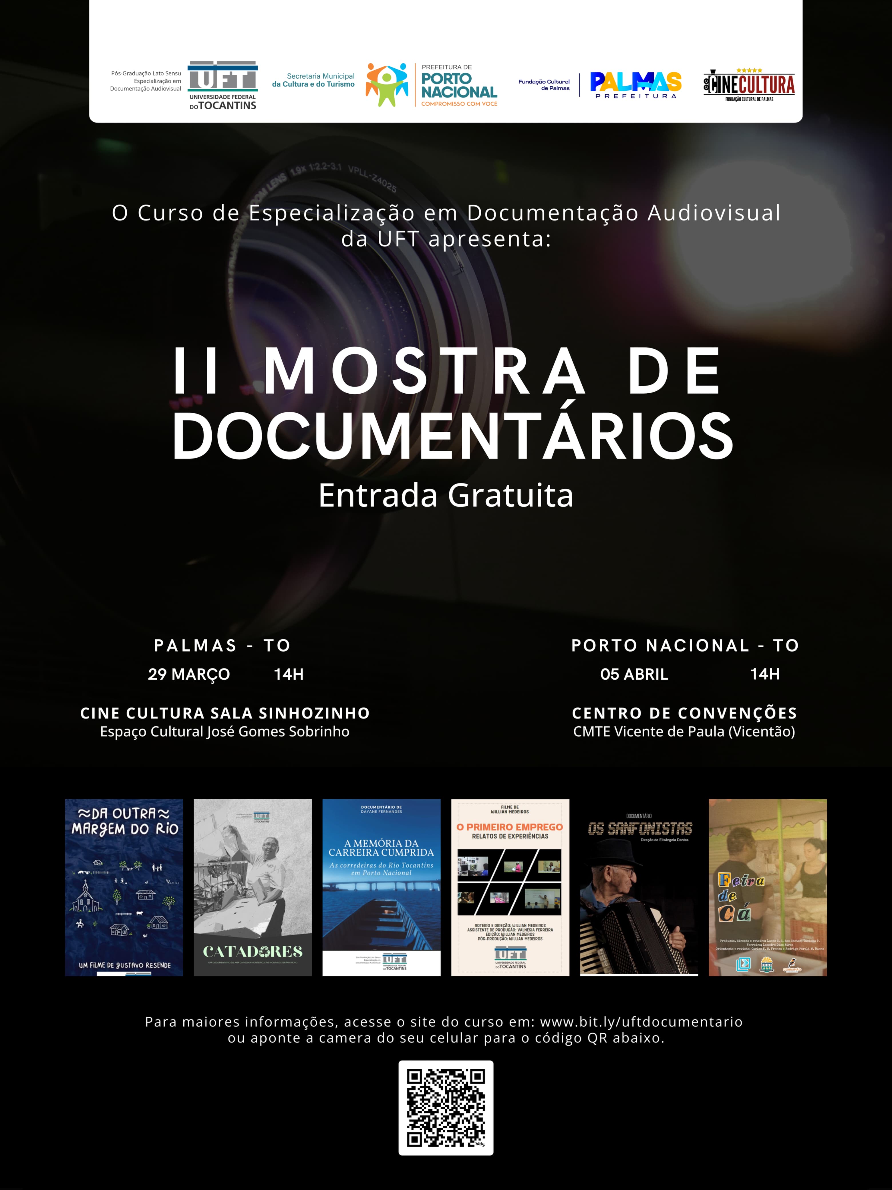 As cidades de Palmas e Porto Nacional serão palco da II Mostra de Documentários da Universidade Federal do Tocantins (UFT), evento organizado pelo curso de Especialização em Documentação Audiovisual do Câmpus de Porto Nacional, conta com a parceria da Idearte Audiovisual e das prefeituras de Porto Nacional e Palmas. A mostra acadêmica, que promete exibir produções de alta qualidade, será realizada em dois finais de semana: